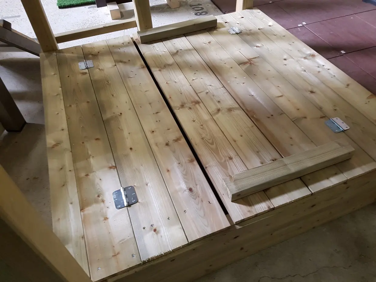 Sandkastenabdeckung für den Blue Rabbit Spielturm Pagoda. Damit schützen Sie den Sand zum Beispiel vor Katzen. Die Sandkastenabdeckung kann einfach aufgeklappt werden – auf der einen Seite entsteht eine Bank mit Rückenlehne, auf der anderen Seite eine Bank ohne Rückenlehne.