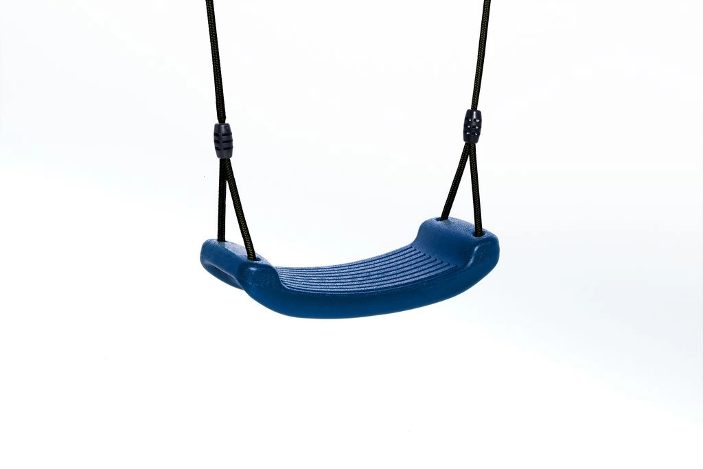 Schaukelsitz aus Kunststoff in der Farbe Blau. Eine robuste Schaukel, besonders für Kinder. Die Größe ist 42x17x8,5cm. Dieser Kunststoff Schaukelsitz ist mit einem schwarzen BR-Seil ausgestattet. Ringe und verstellbare Achsen aus verzinktem Stahl.