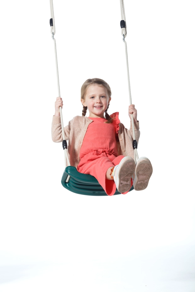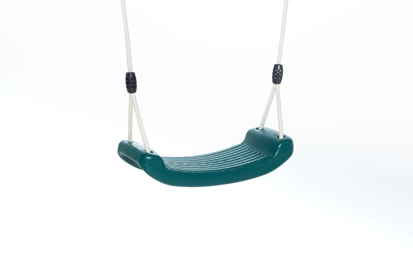 Kunststoff-Schaukelsitz in einer schönen grünen Farbe. Dieser Schaukelsitz hat eine Gesamtbreite von 420 mm, die Tiefe beträgt etwa 170 mm. Das Schaukel-Seil ist verstellbar und besteht aus beige BR-Seil, sodass es nicht an den Fingern brennt. Dieser dunkelgrüne Schaukelsitz ist für Schaukeln geeignet, bei denen der Schaukelbalken (Unterseite) eine Höhe von ca. 190 cm bis 240 cm hat.
