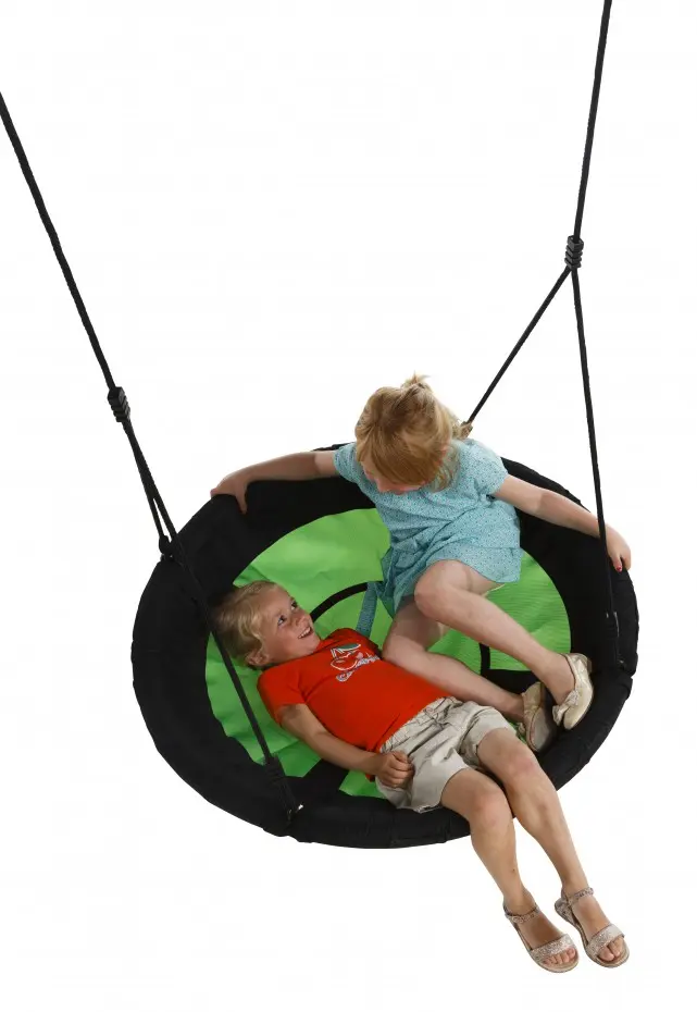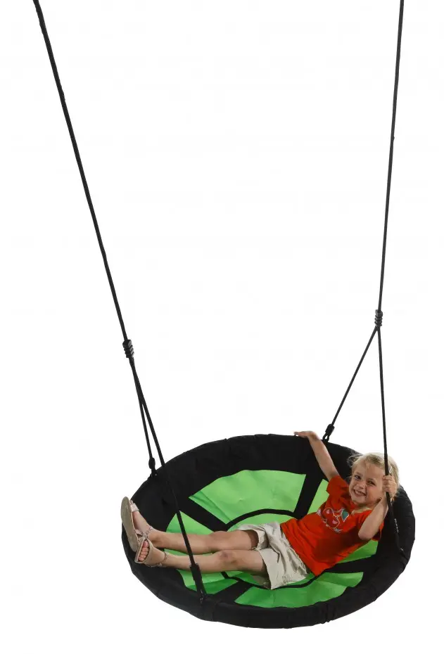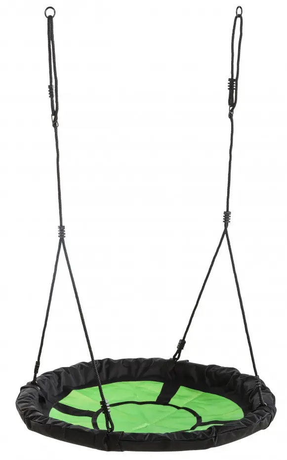Nestschaukel Swibee Grün ist eine wunderschöne Nestschaukel für extra großen Spaß! Eine lustige, runde Nestschaukel mit einem Durchmesser von 98 cm. Auf der Swibee-Nestschaukel können mehrere Kinder gleichzeitig schaukeln. Der grün/schwarze Schaukelkorb ist mit schwarzen Seilen ausgestattet.
