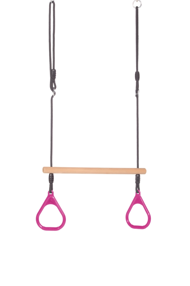 Das Holzringtrapez ist mit Kunststoffringen in der Farbe Rosa ausgestattet. Machen Sie verschiedene Kunststücke an den Ringen und dem Trapez. Das Ringtrapez garantiert viel Spielspaß!