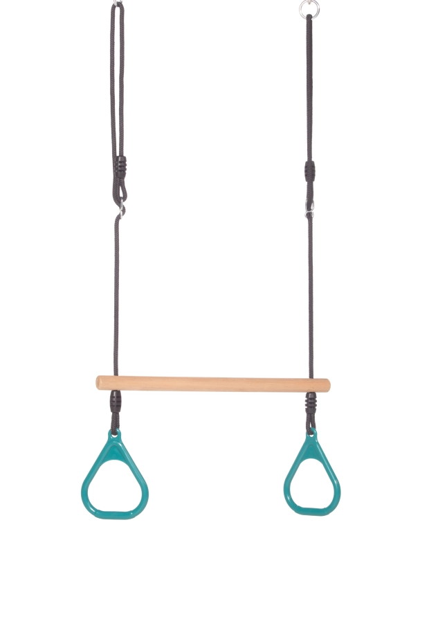 Holzringtrapez mit Kunststoffringen in frischem Türkis. Das Trapez ist mit einem schwarzen BR-Seil ausgestattet, das die Finger nicht verbrennt. Zeit, deine akrobatischen Künste mit diesem Trapez zu üben!