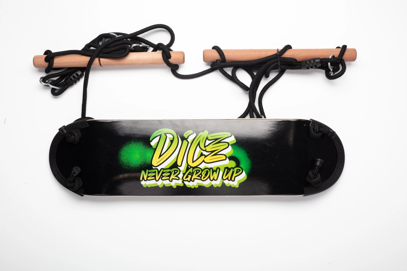 Coole Skateboard-Schaukel für Kinder. Die Sitzfläche misst 81x20 cm. Die Schaukel hat eine weiche EVA-Oberfläche und schützende Stoßfänger an den Ecken. Das schwarz geflochtene BR-Seil ist höhenverstellbar für Schaukeln bis ca. 250 cm Höhe. Am Seilende befindet sich ein Aufhängering für einfache Montage.