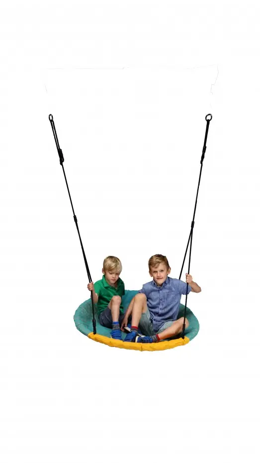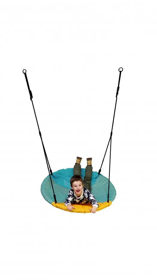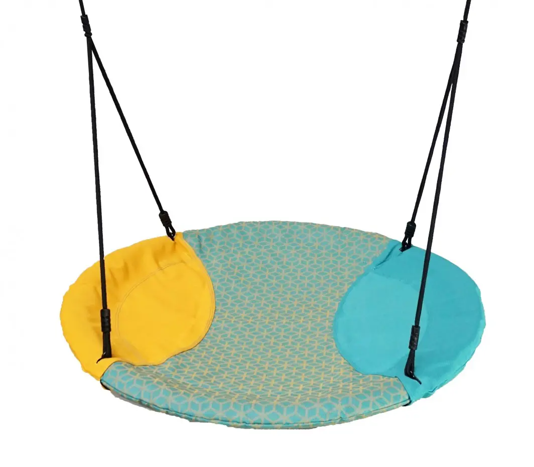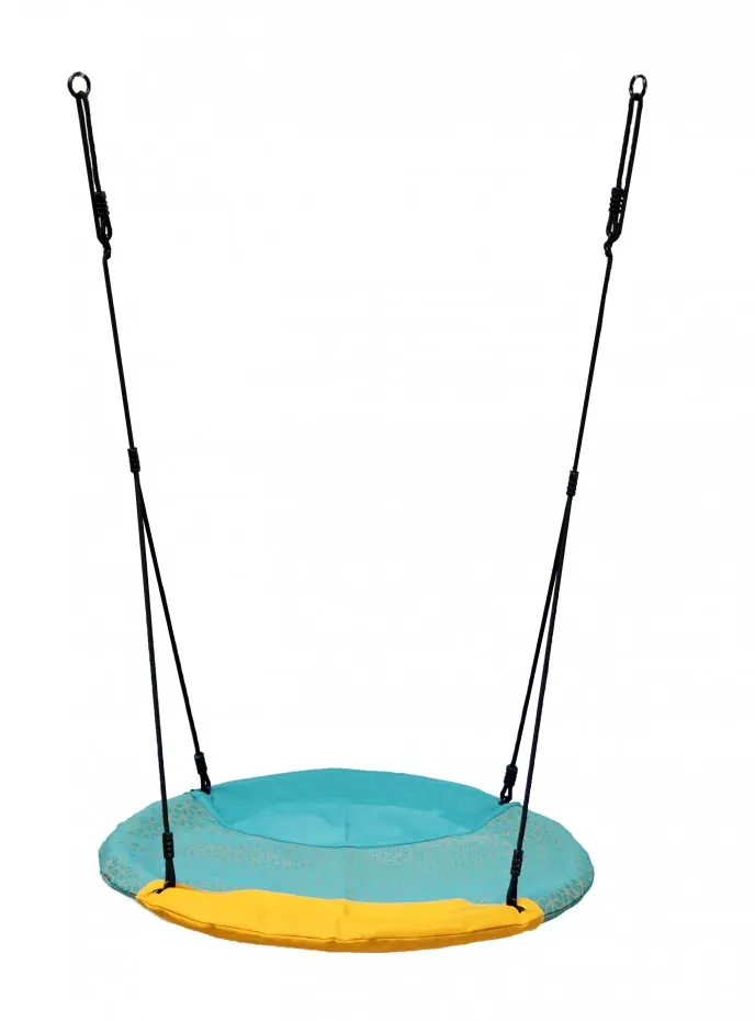 Wunderschöne runde Nestschaukel Winkoh für extra großen Spaß! Eine solide Schaukel, auf der mehrere Kinder gleichzeitig schaukeln können. Der Schaukelkorb Winkoh ist in Türkis und Gelb gehalten und hat BR-Seile. Diese geflochtenen Seile sind sehr kinderfreundlich und brennen nicht an den Fingern.