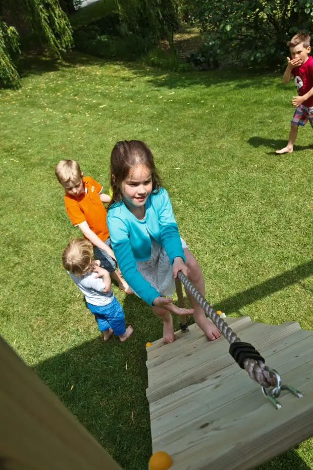 Kletterwand @ramp ist eine herausfordernde Wand mit extra dickem Seil. Sie ist 50 cm breit und passt auf ein Spielgerät mit einer Plattformhöhe von 150 cm. Geeignet für Spielgeräte der Blue Rabbit Serie.