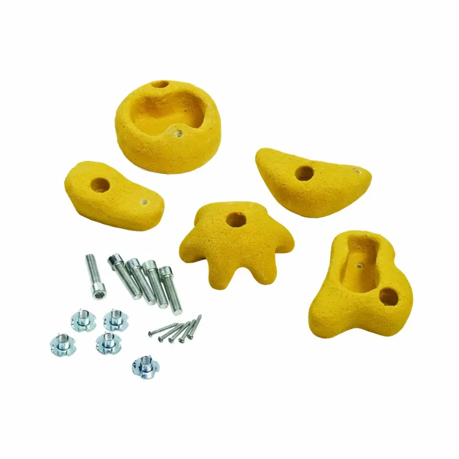 Dieses Set enthält 5 gelbe Klettersteine mit einem Durchmesser von ca. 100-120 mm. Die Steine sind durchgefärbt und werden komplett mit Zylinderbolzen (M10), Einschlagmuttern und Schrauben geliefert. Sie bestehen aus langlebigem Kunstharz und sind mit einem integrierten Metalleinsatz ausgestattet. Dank der doppelten Befestigung bleiben die Klettersteine fest an ihrem Platz, was für ein sicheres und zuverlässiges Klettergerüst sorgt.