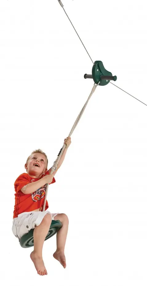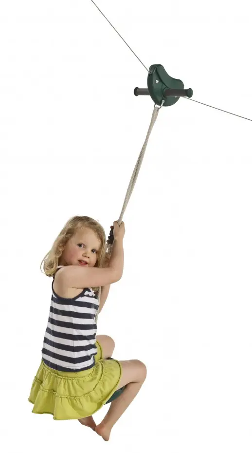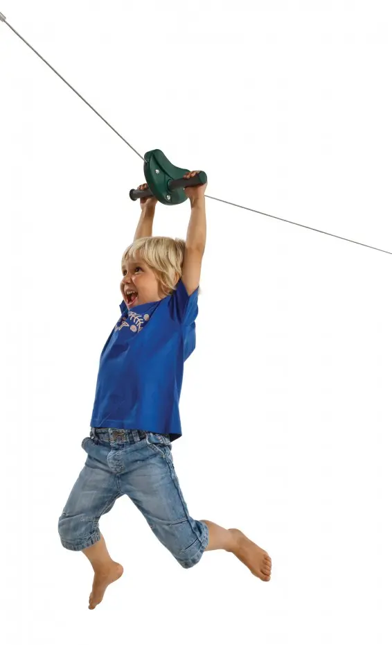 Seilbahn für privaten Gebrauch. Pure Freude im eigenen Garten – fliegend oder schaukelnd durch die Luft! Ganze 30 Meter lang. Geeignet für 1 Benutzer ab 6 Jahren und bis 70 kg. Inklusive Tellerschaukel!