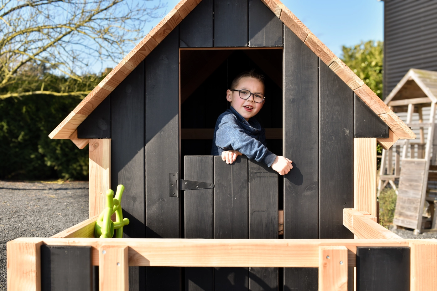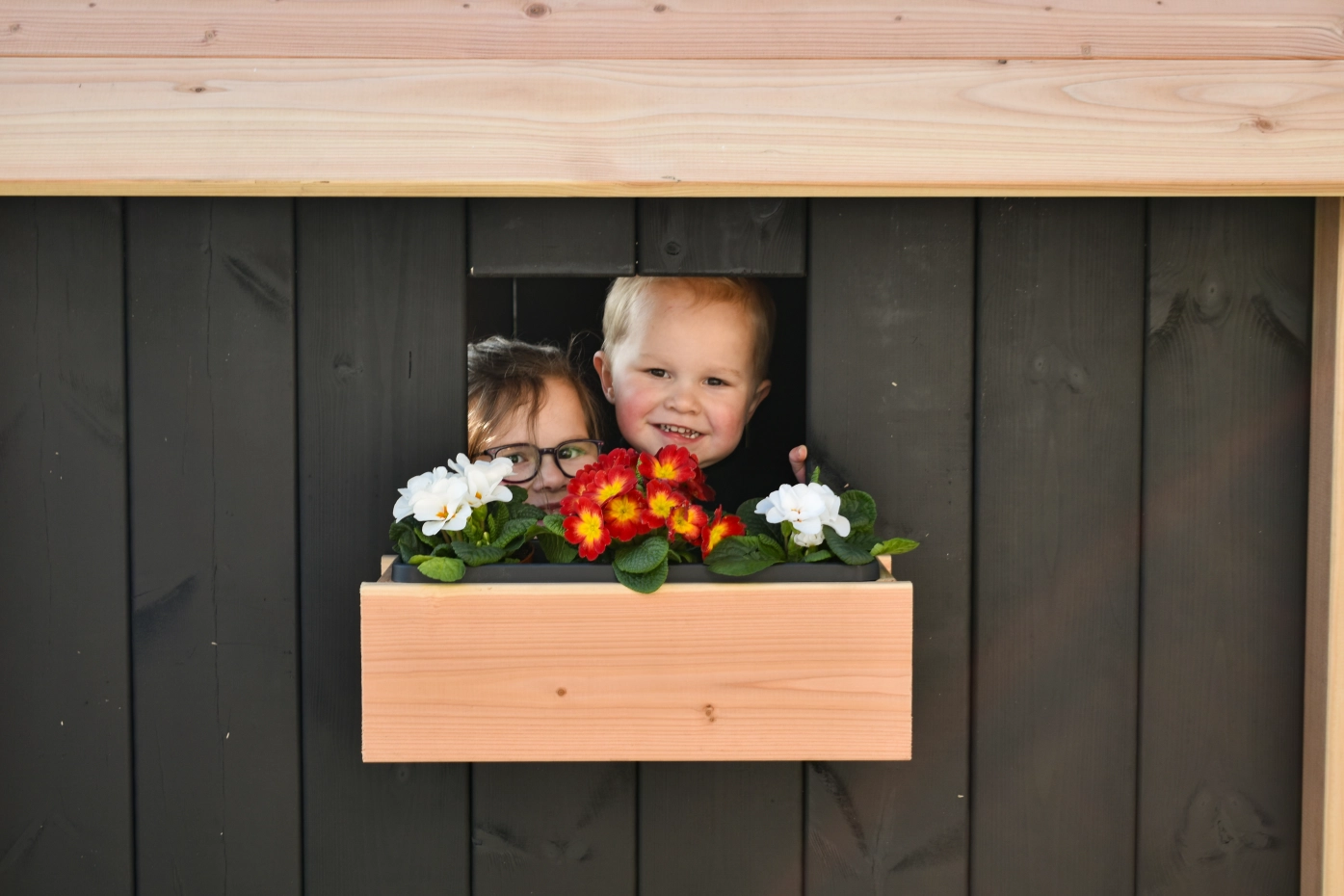 Die Kombination aus Douglasienholz und schwarzen Brettern verleiht dem Spielhaus ein edles und stilvolles Aussehen – ein echter Hingucker im Garten!