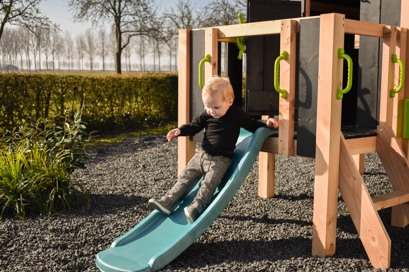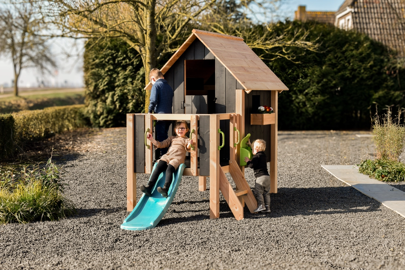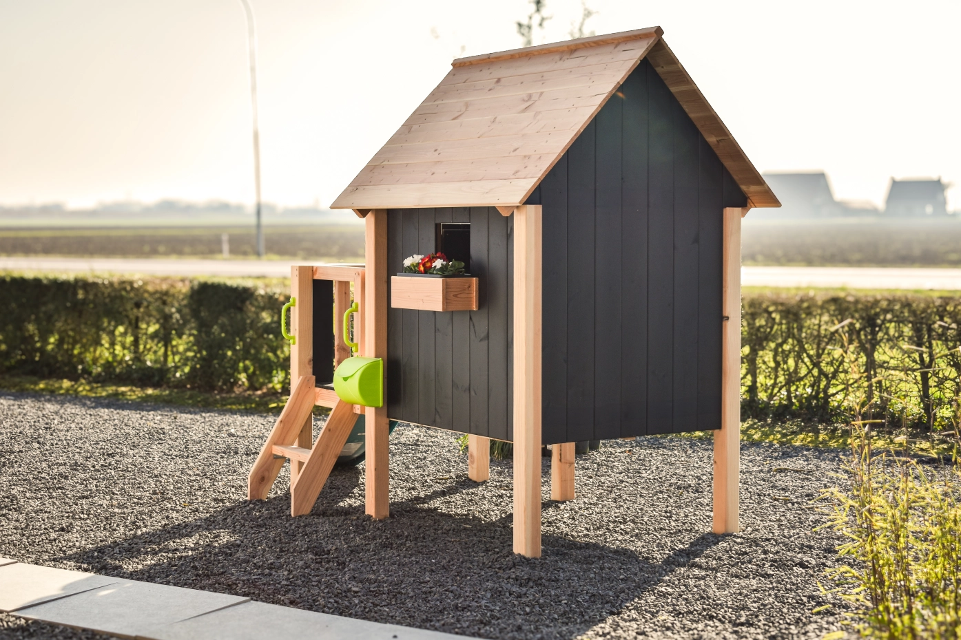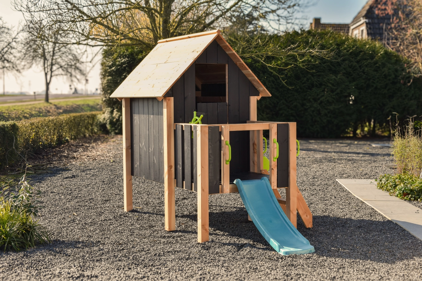 Spielhaus Dream 60 ist ein gemütliches und stabiles Spielhäuschen mit einer Podesthöhe von 60 cm – niedrig am Boden, aber mit einer lustigen Rutsche für viel Spielspaß.