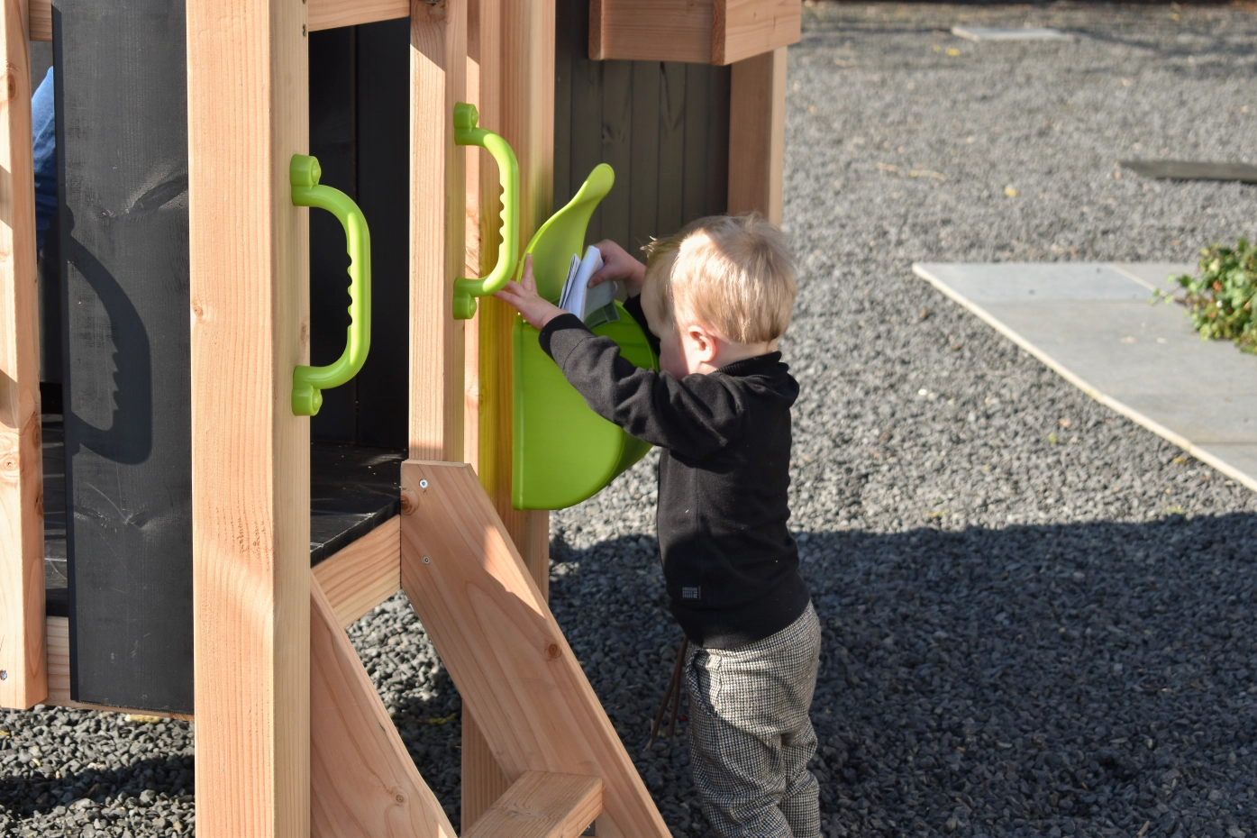 Der Zugang erfolgt durch die verspielte Tür, und dank des Geländers rund um das Podest ist sicheres Spielen garantiert.