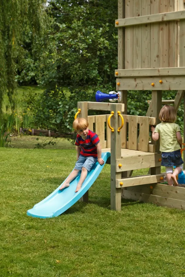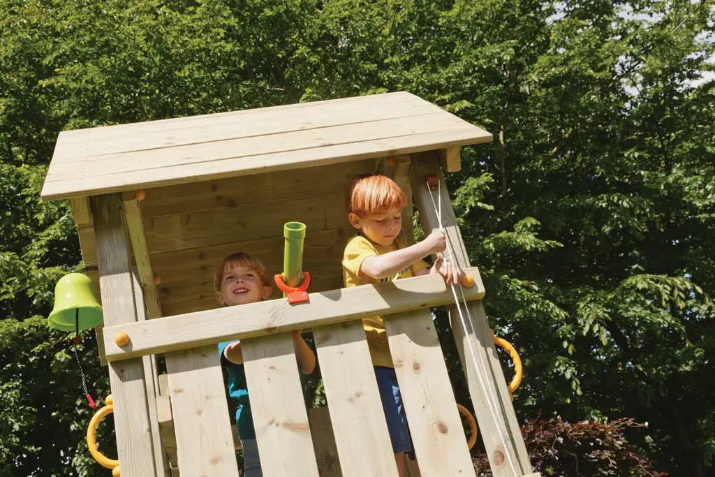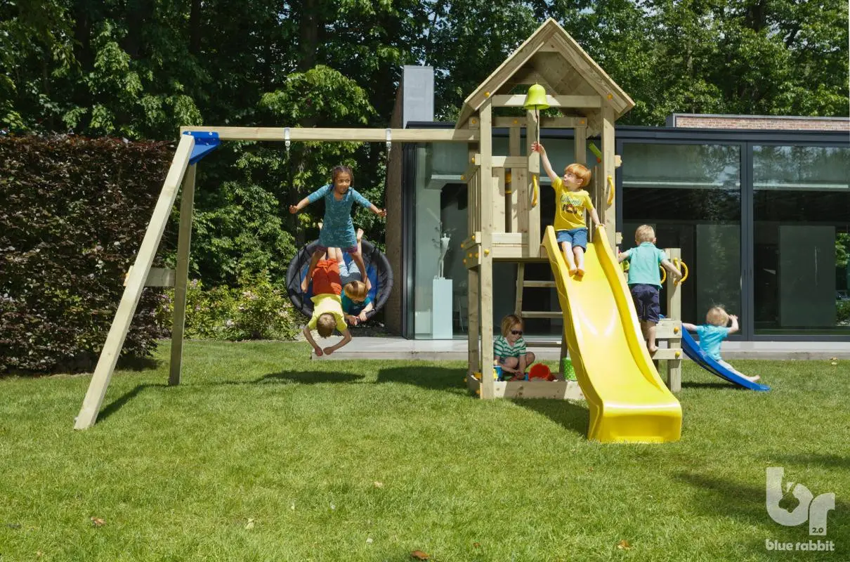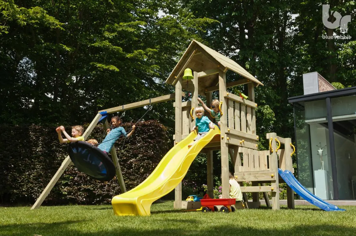 Spielturm Kiosk niedrig mit Schaukelanbau und Rutsche ist alles, was ein Spielturm sein muss! Ein schöner Spielturm von Blue Rabbit mit einem hervorragenden Preis-Leistungs-Verhältnis. Der Spielturm Kiosk hat eine Plattformhöhe von 120 cm und ist mit einem Anbauschaukel, einer Rutsche und einem Anbauplattform mit kleiner Rutsche ausgestattet. Der Spielturm kann einfach mit verschiedenen Anbauelementen erweitert werden.