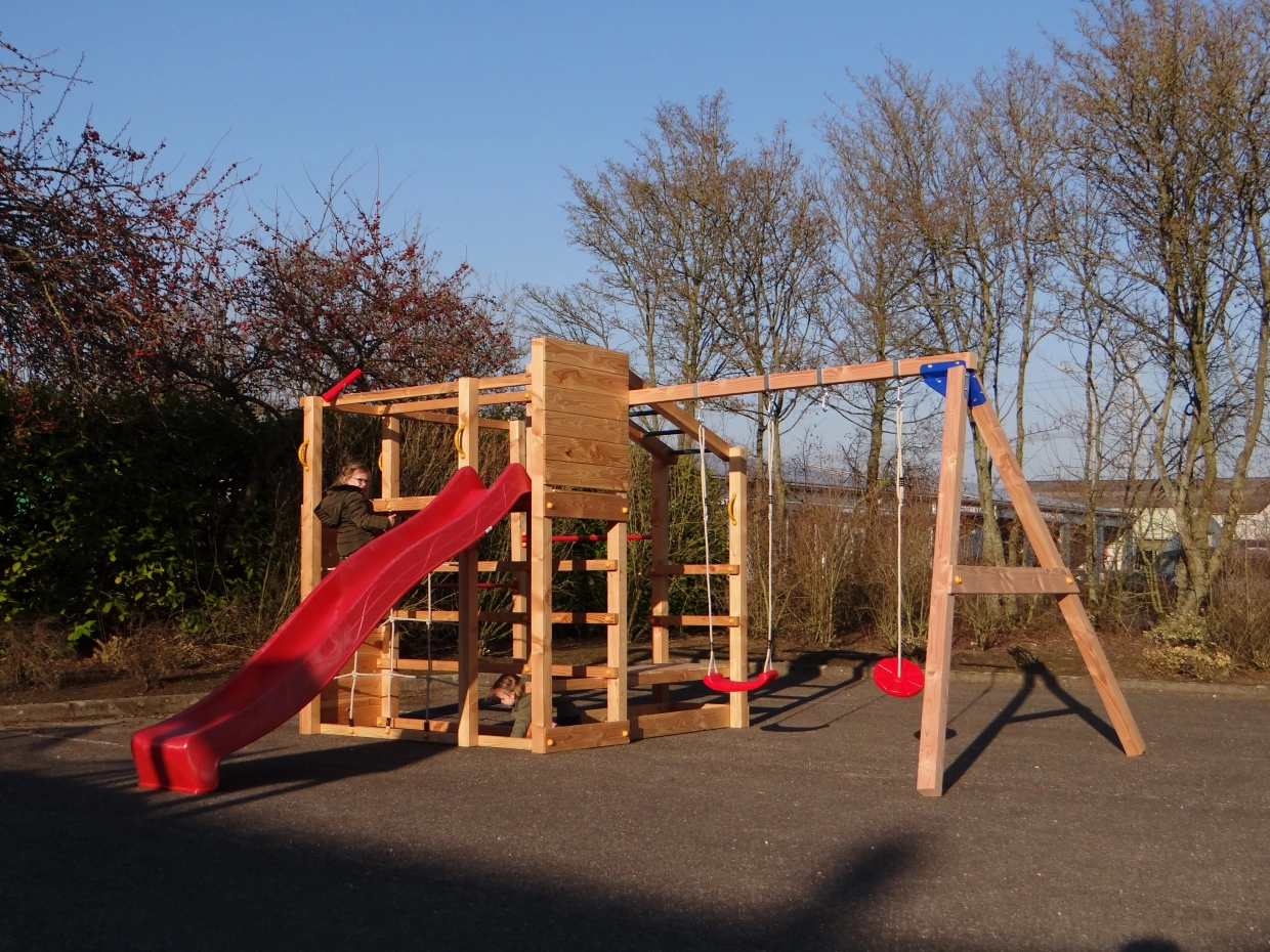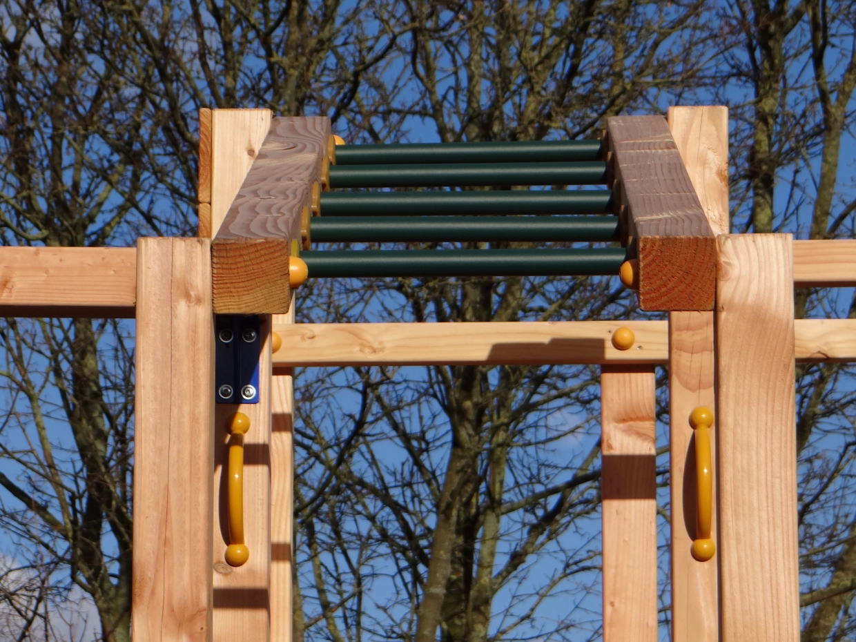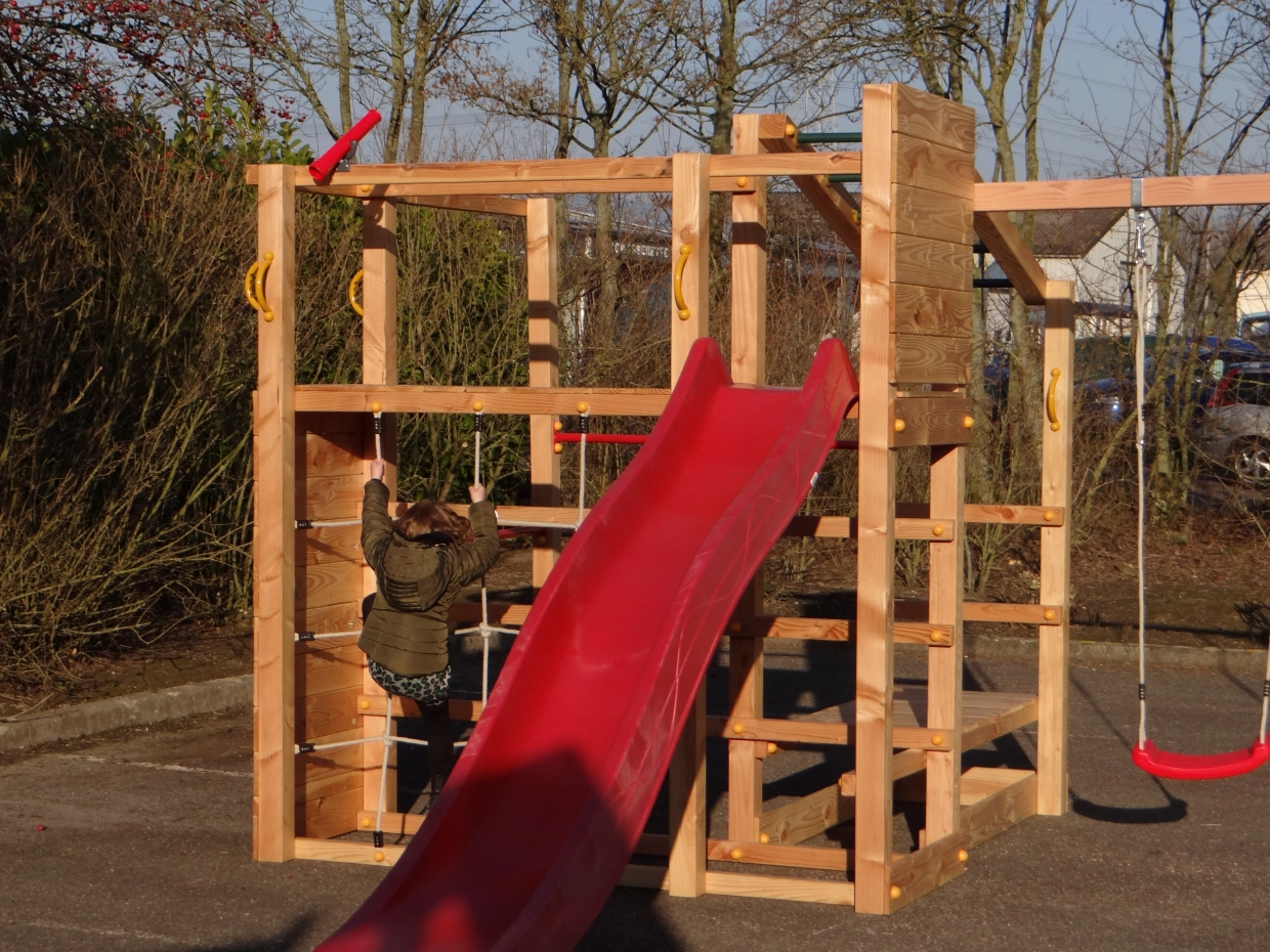 Das Klettergerüst ist mit einem Kletternetz, einer Affenbrücke und einer Kletterwand mit bunten Klettersteinen, zwei Metallpurzelbäumen und Klettergerüsten ausgestattet. Die angebaute @Swing-Schaukel bietet eine zusätzliche Herausforderung für die Kinder. An der @Swing kann allerlei Zubehör angebracht werden: Punchingball, Turnringe, Strickleiter oder Schaukelsitz. Diese können einfach mitbestellt werden.
