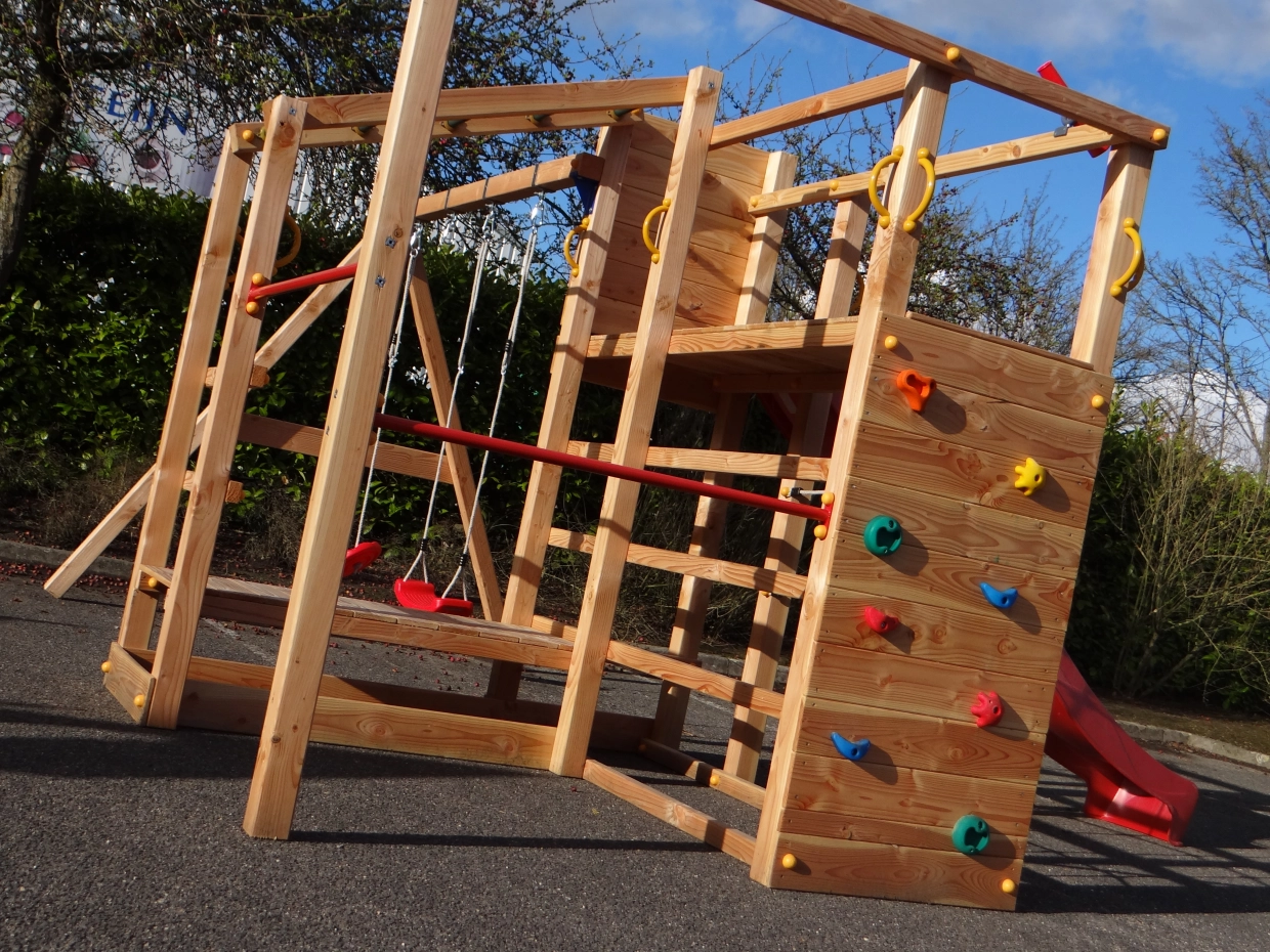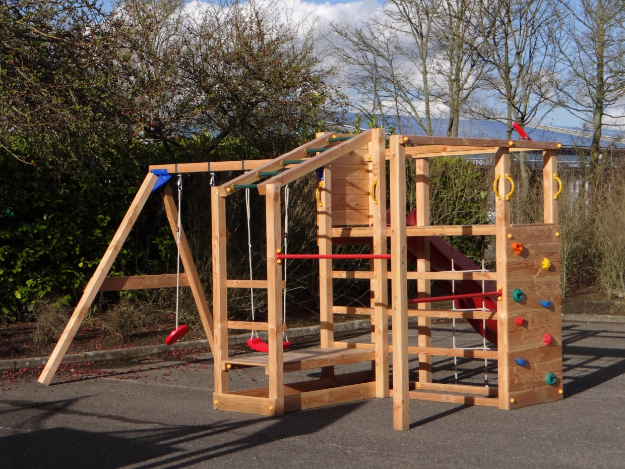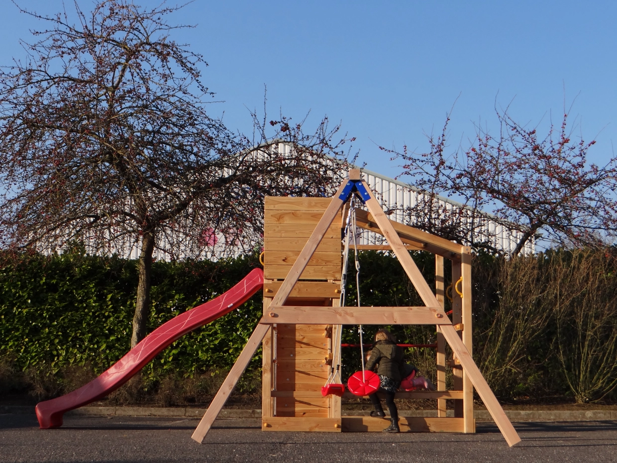 Das Klettergerüst ist mit einem Kletternetz, einer Affenbrücke und einer Kletterwand mit bunten Klettersteinen, zwei Metallpurzelbäumen und Klettergerüsten ausgestattet. Die angebaute @Swing-Schaukel bietet eine zusätzliche Herausforderung für die Kinder. An der @Swing kann allerlei Zubehör angebracht werden: Punchingball, Turnringe, Strickleiter oder Schaukelsitz. Diese können einfach mitbestellt werden.