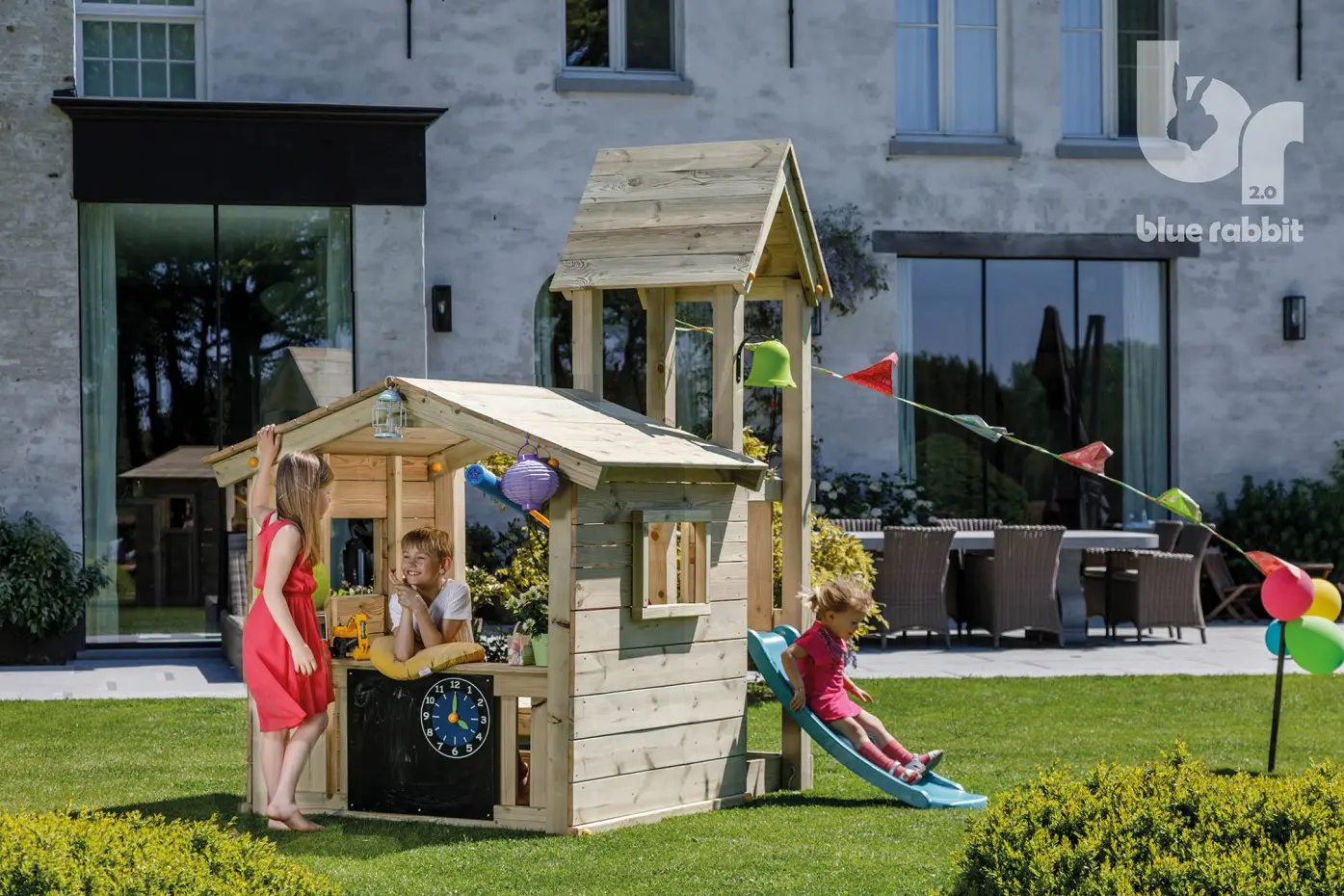 Das Spielhaus Lookout hat eine Tür mit magnetischem Schloss. An der Seite gibt es einen Tresen, um Kaufladen zu spielen und andere Spiele zu machen. Kinder werden sich sofort in dieses niedliche Blue Rabbit Spielhaus Lookout verlieben. Ein großartiges Spielhaus mit vielen Spielmöglichkeiten.