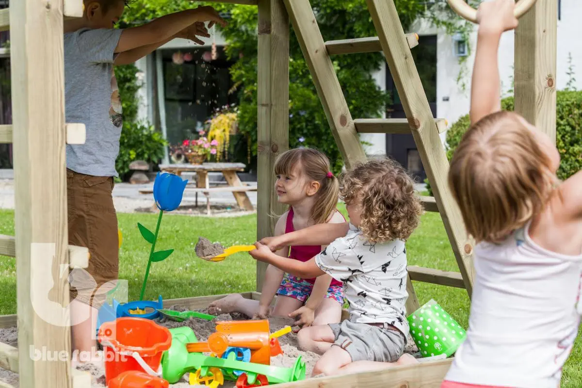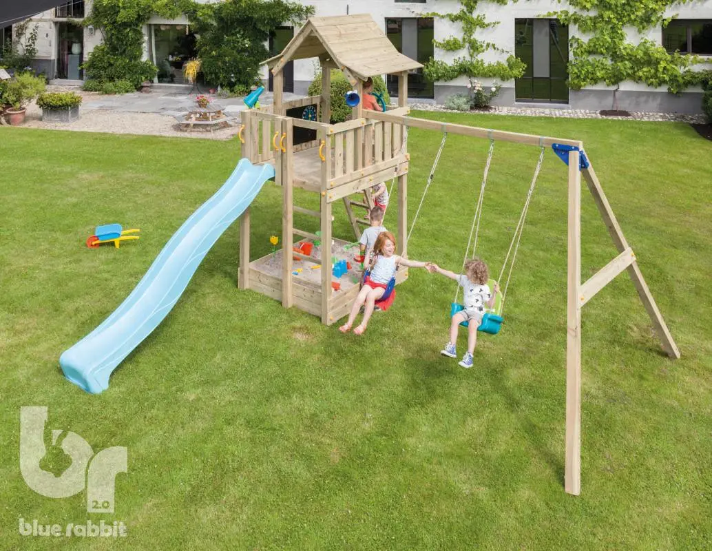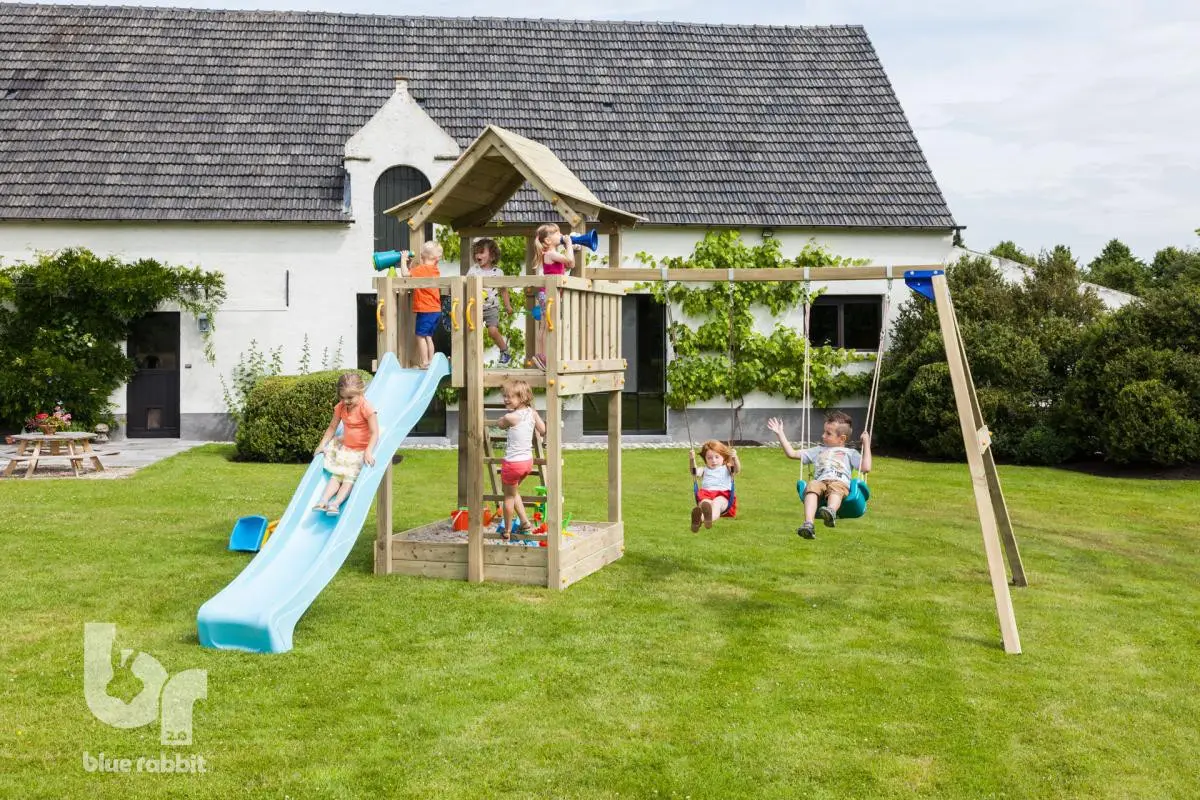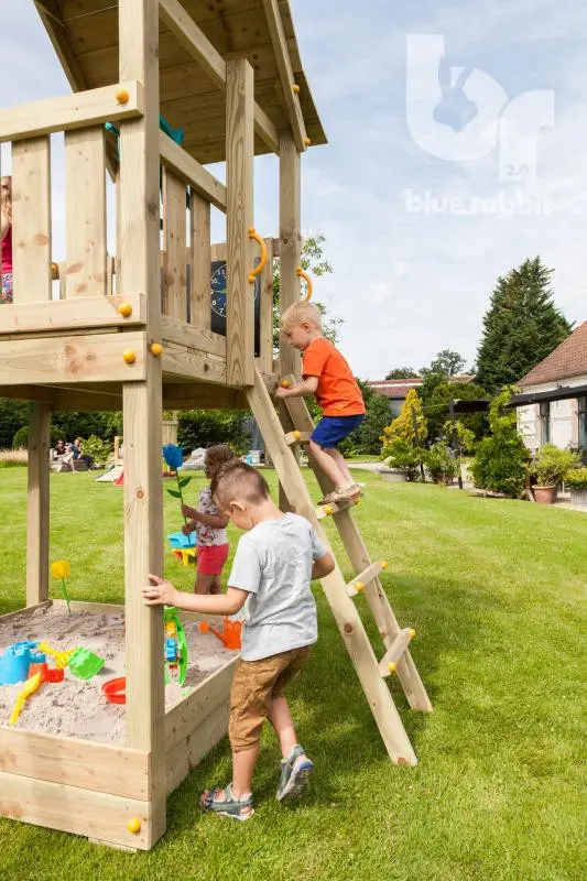 Die Pagoda hat den größten Spielraum der gesamten Blue Rabbit 2.0 Serie, mit einer Fläche von 1,4 m x 1,6 m, sodass die Kinder ausreichend Platz zum Spielen haben. Auch der große Sandkasten unter dem Turm bietet eine enorme Fläche zum Graben und Sandburgen bauen. Die einzigartige Pagoda ähnelt einem alten chinesischen Tempel. In Kombination mit der Anbauschaukel @Swing bietet dieser Spielturm viel Abwechslung für Kinder. Dieser Spielturm hat eine Plattformhöhe von 120 cm. Die Blue Rabbit Pagoda hat 2 Eingänge, einen an der Rückseite (eine schräge Leiter) und einen an der Vorderseite (eine vertikale Leiter). Die vordere Öffnung kann auch verwendet werden, um ein zusätzliches Modul an die Pagoda anzubringen, wie z. B. eine Kletterwand @wall oder ein Kletternetz @net.