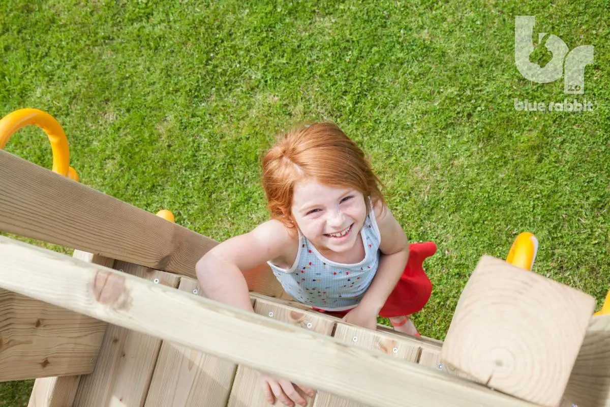 Die Blue Rabbit Pagoda hat 2 Eingangsöffnungen, eine auf der Rückseite (eine schräge Leiter) und eine auf der Vorderseite (eine senkrechte Leiter). Die vordere Öffnung kann auch verwendet werden, um ein zusätzliches Modul an die Pagoda anzufügen, wie zum Beispiel eine Kletterwand (@wall) oder ein Kletternetz (@net).