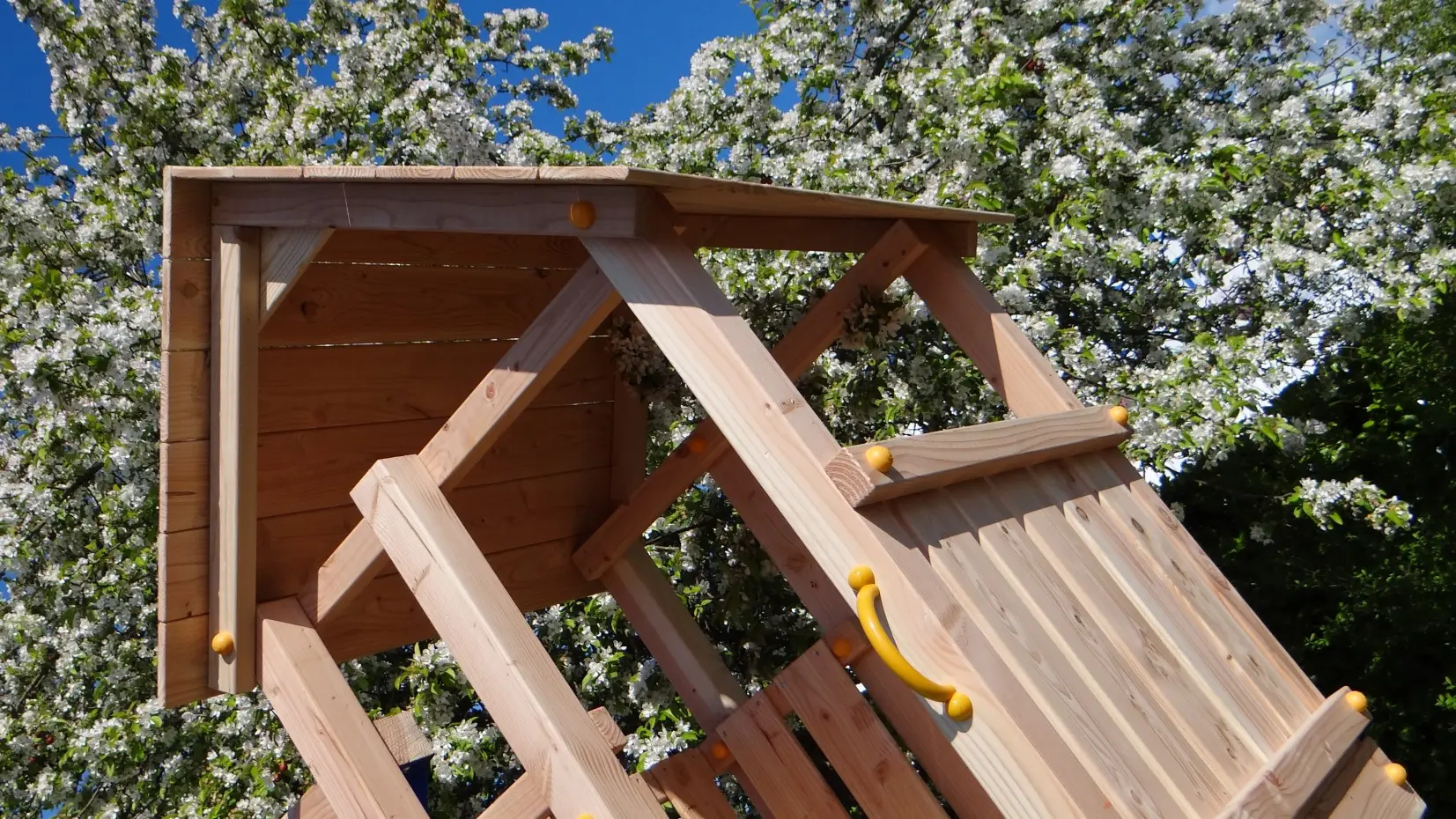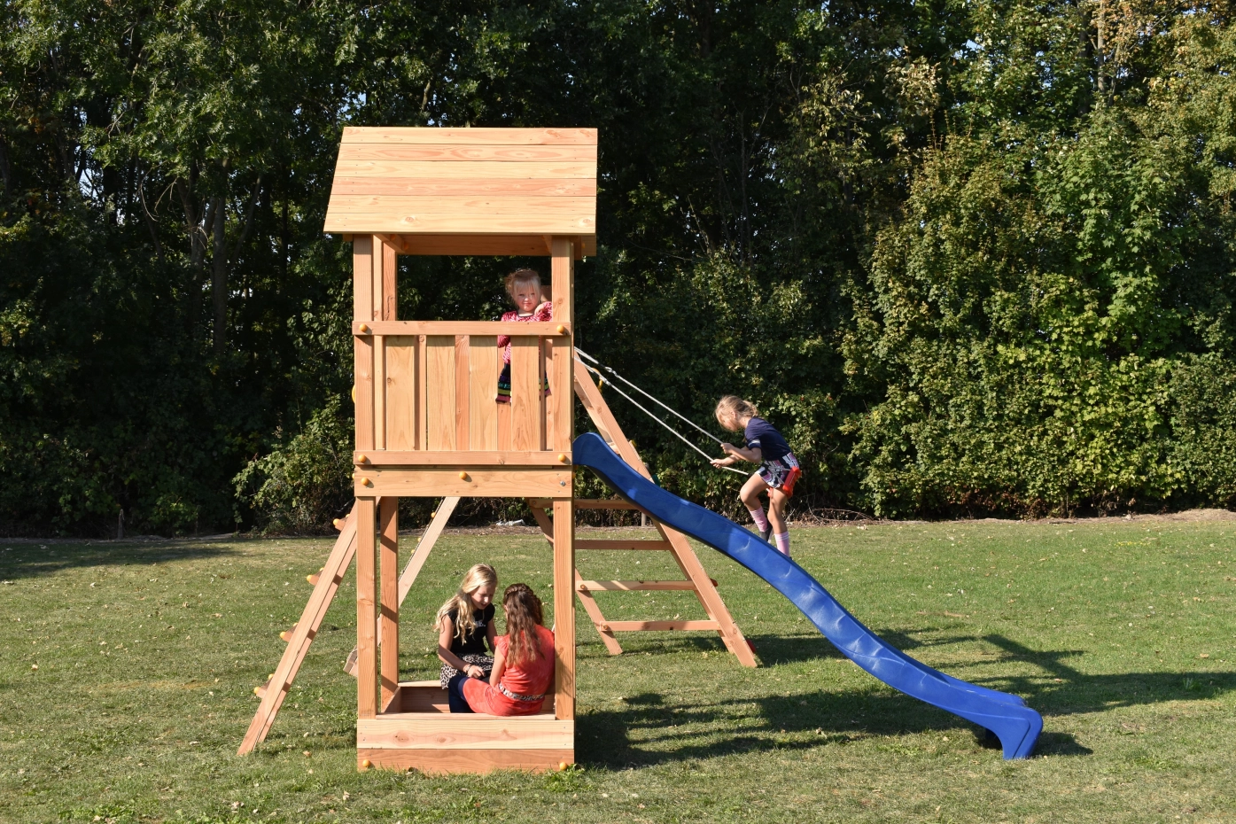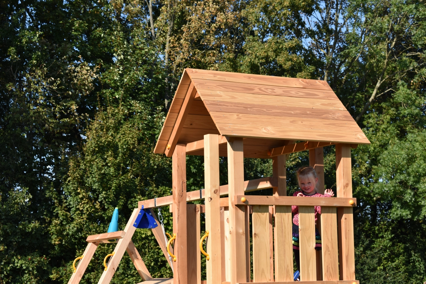Das Spielgerät Kiosk aus Douglasienholz mit Rutsche und @Challenger ist ein wunderschöner und langlebiger Spielturm, der kompakt aufgestellt werden kann und perfekt in den modernen Garten passt! Der @Challenger ist komplett ausgestattet mit einer Schaukel, einer Kletterwand mit Klettersteinen, einem Kletternetz und einer kleinen Treppe! Das langlebige Douglasienholz wird immer häufiger im Garten verwendet. Es hat eine schöne, flammende Maserung und hält unbehandelt in unserem Klima problemlos 10–15 Jahre. Allerdings vergraut es schnell durch die Sonne. Sie können es mit Lasur oder Douglasien-Öl schützen.