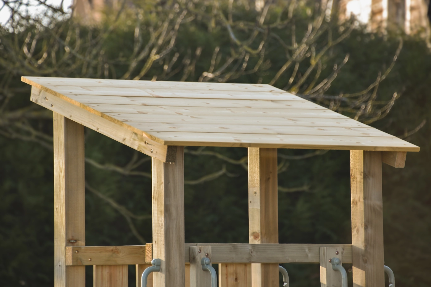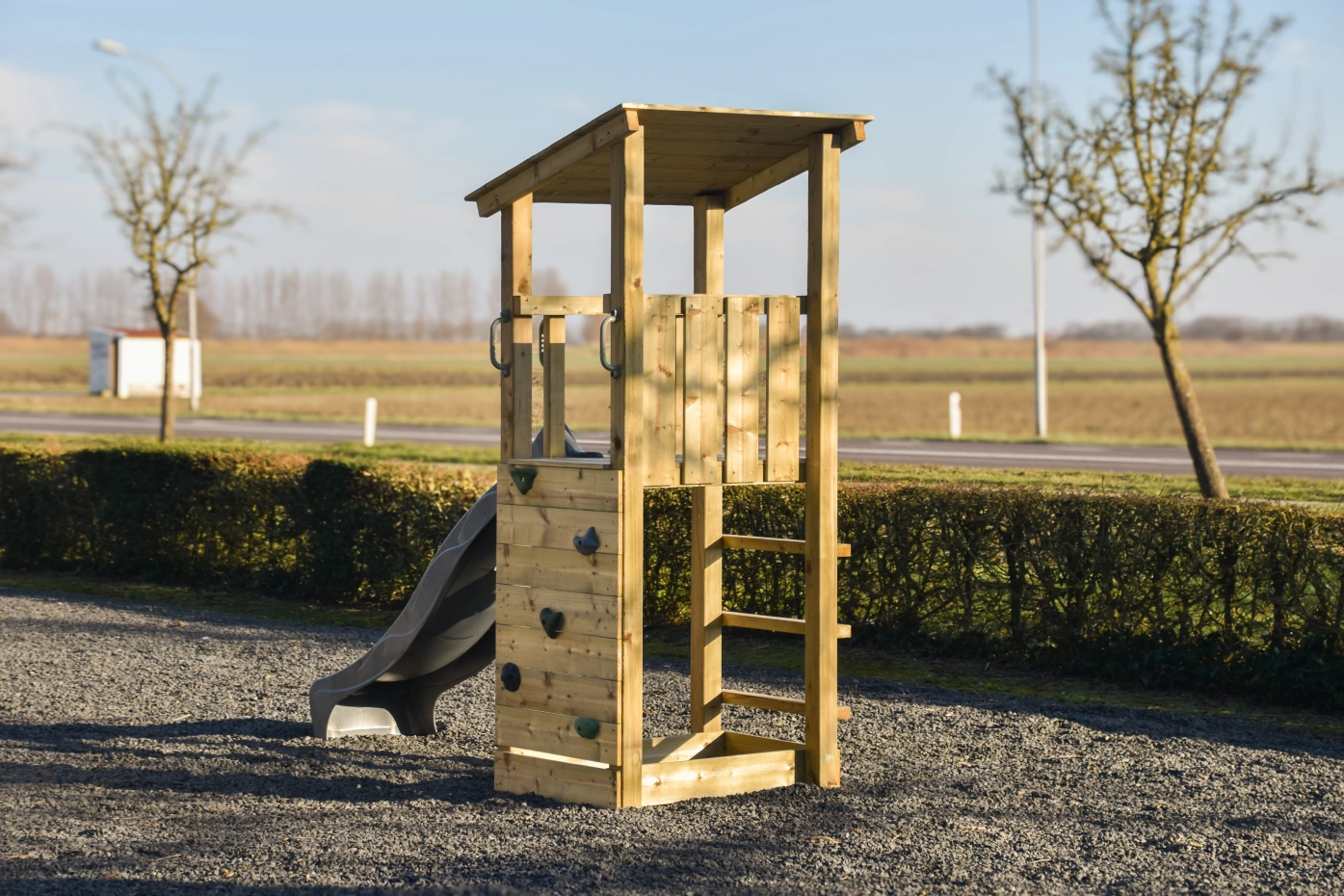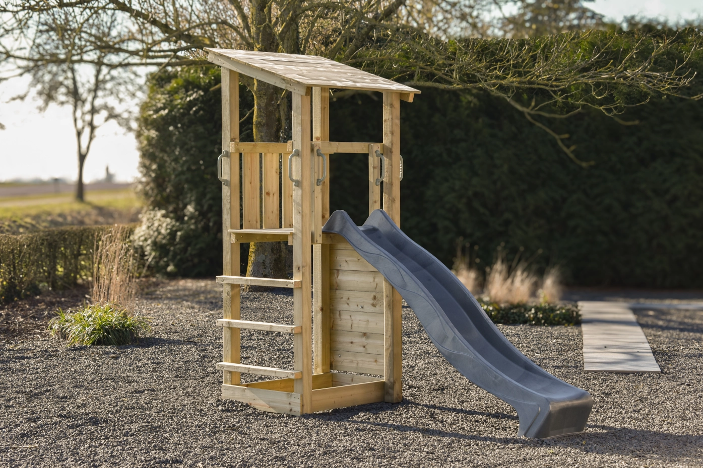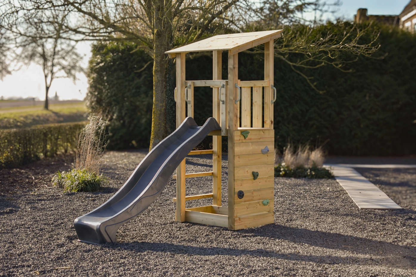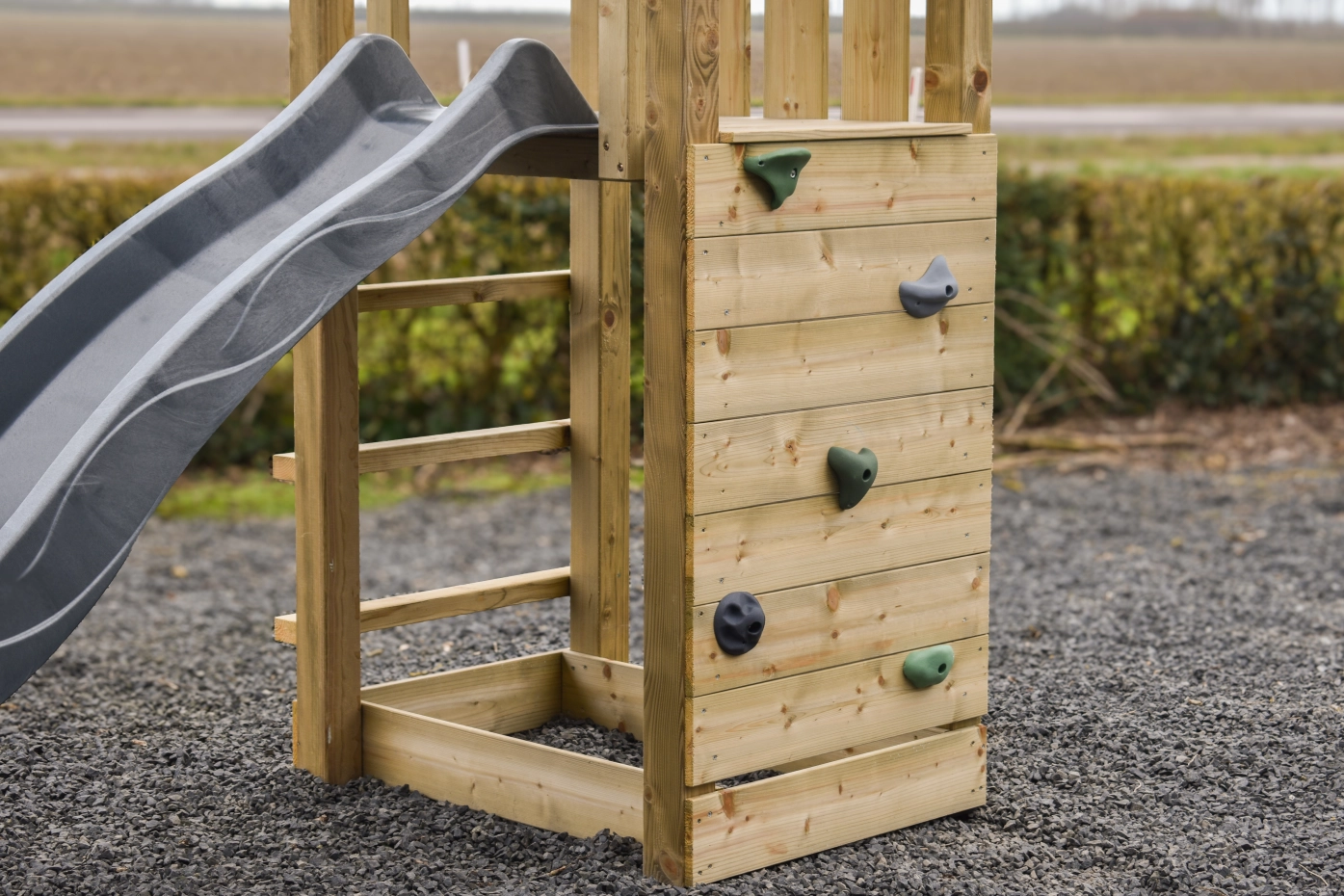 Über die Kletterleiter mit stabilen Stufen gelangen Kinder auf die Plattform in 120 cm Höhe. Das geschlossene Geländer sorgt hier für zusätzliche Sicherheit und schafft einen geschützten Ort zum Spielen, Träumen oder Planen geheimer Missionen. Die Rutsche ermöglicht eine schnelle und spaßige Abfahrt, und mit den praktischen Handgriffen wird das Klettern noch einfacher und sicherer.