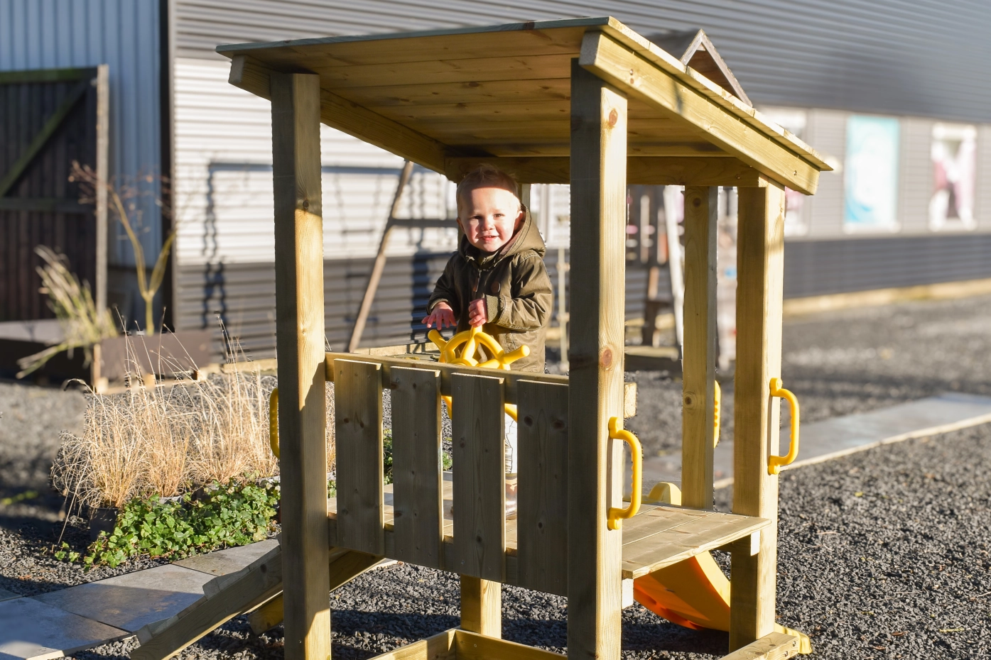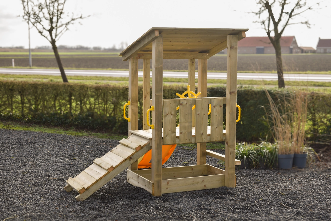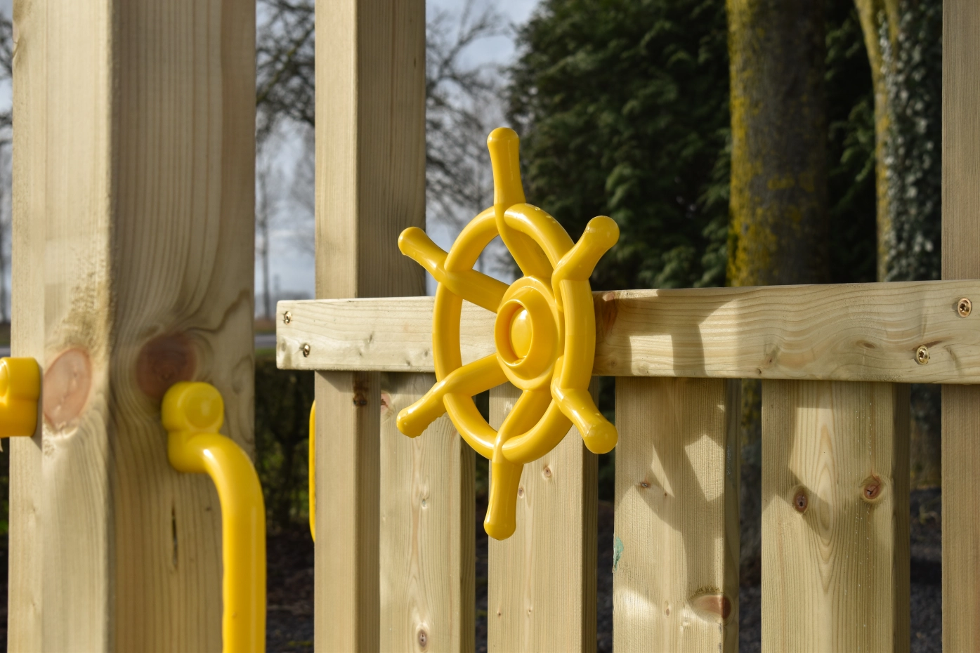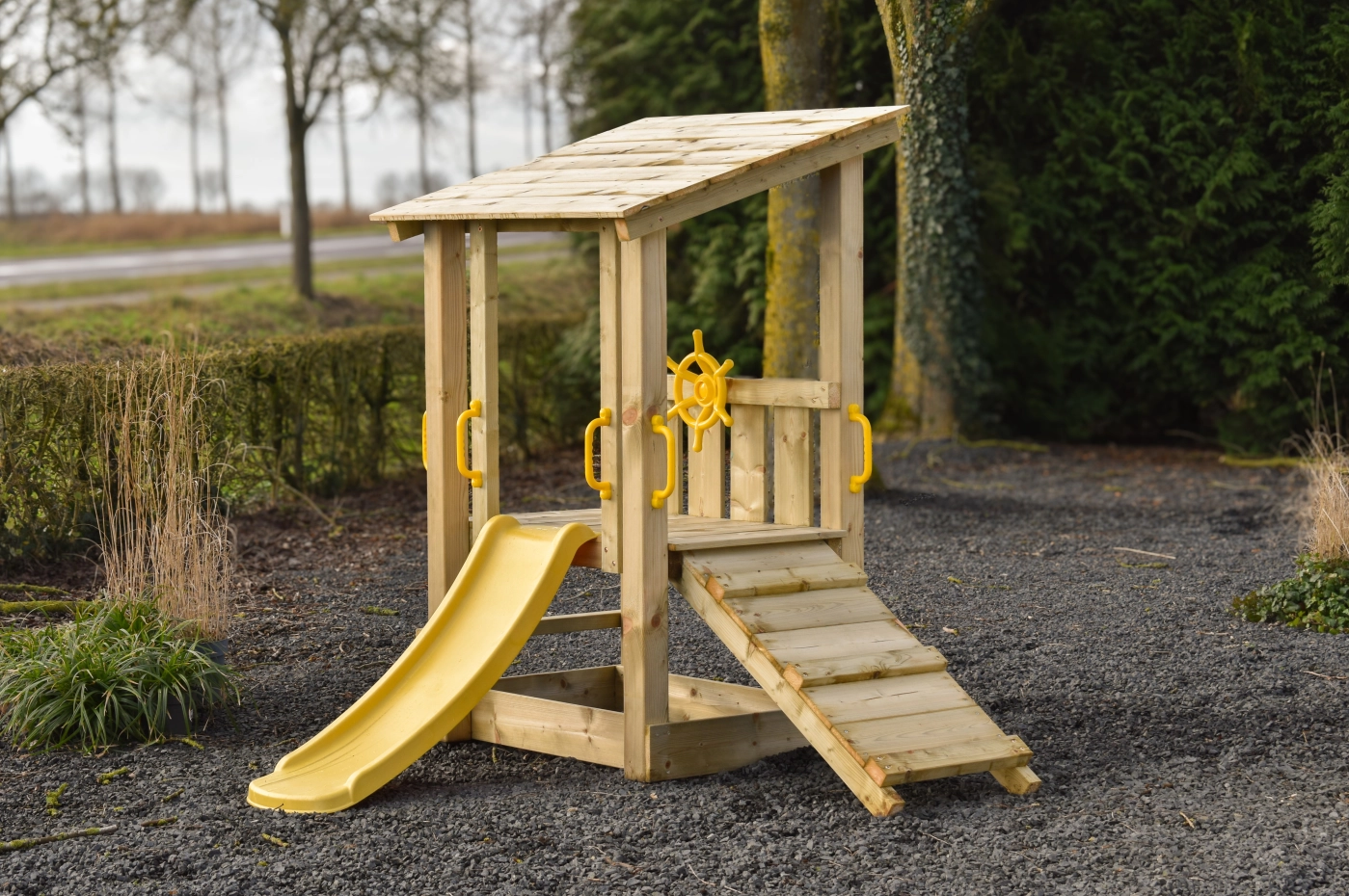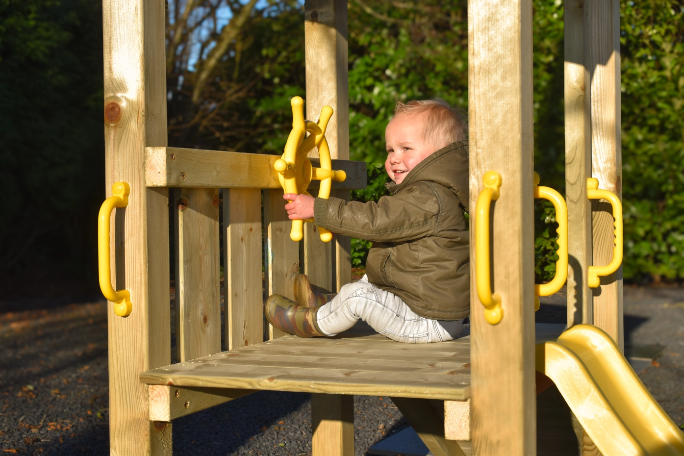 Ausgestattet mit einem Kletteraufstieg und einer Rutsche fördert das Spielgerät auf spielerische Weise die Motorik. Griffe sorgen für zusätzlichen Halt. Optional ist ein gelbes Steuerrad erhältlich, das die Fantasie anregt.
