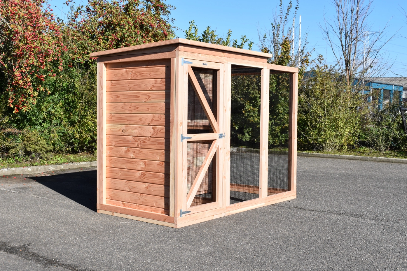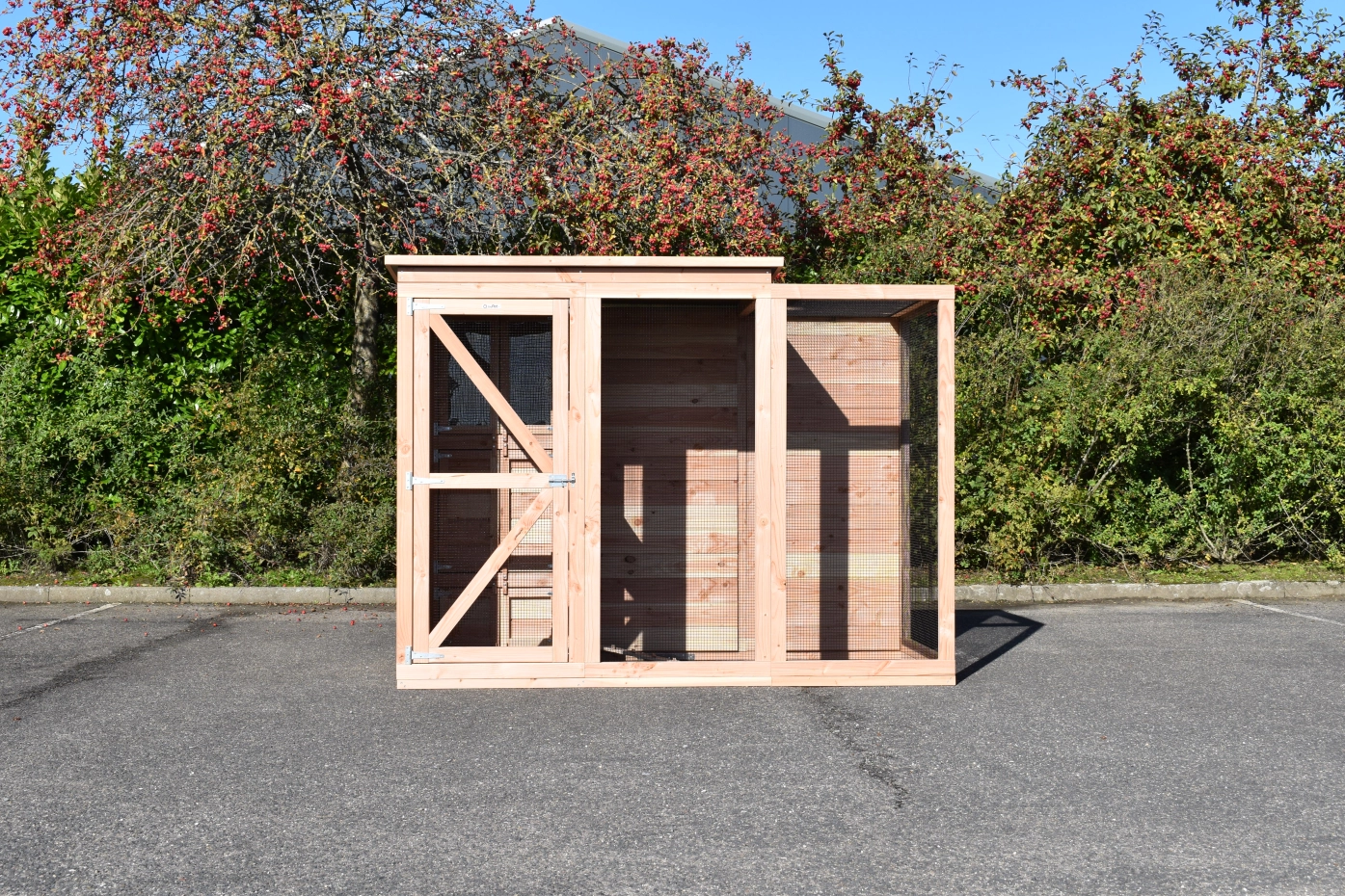 Diese Voliere Flex 3.1+ ist eine geräumige Voliere mit Schleuse und Schutzhaus. In dieser Voliere aus Douglasienholz können Sie tropische Vögel oder Wachteln halten und genießen Sie von vielen praktischen Vorteilen. Das Schutzhaus und ein Teil vom Auslauf sind mit einem geschlossenen Dach versehen. Das ist das höheres Teil vom Dach. Es gibt eine Schleuse von 80x75cm um zu verhindern das die Vögel weg fliegen können wenn Sie die Tür öffnen. Auch das Schutzhaus und Stauraum sind über die Schleuse zu erreichen. Die Tür in der Schleuse ist von beiden Seiten abschließbar.