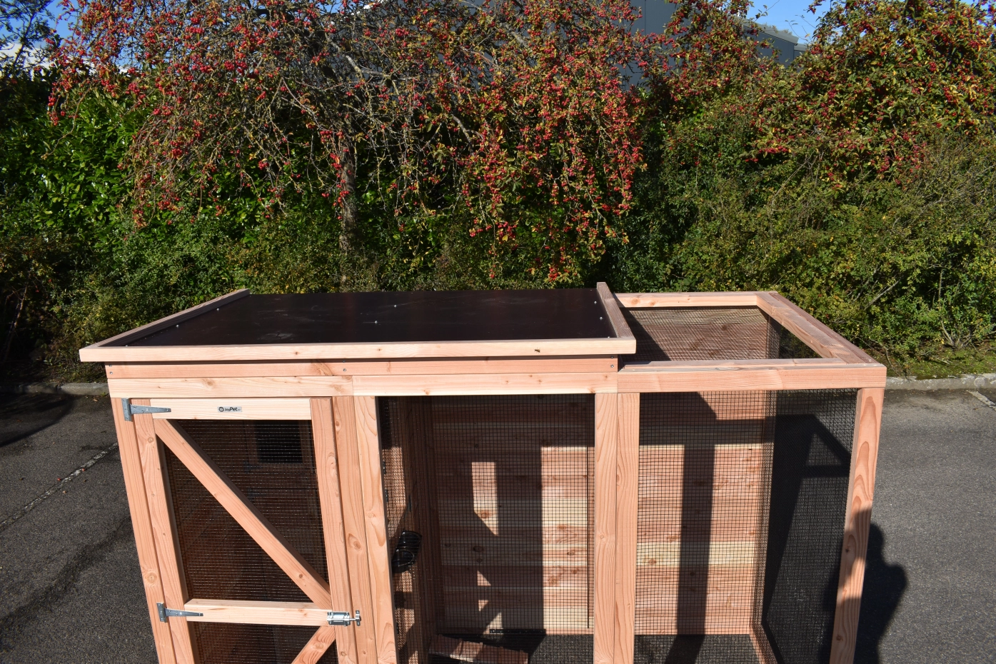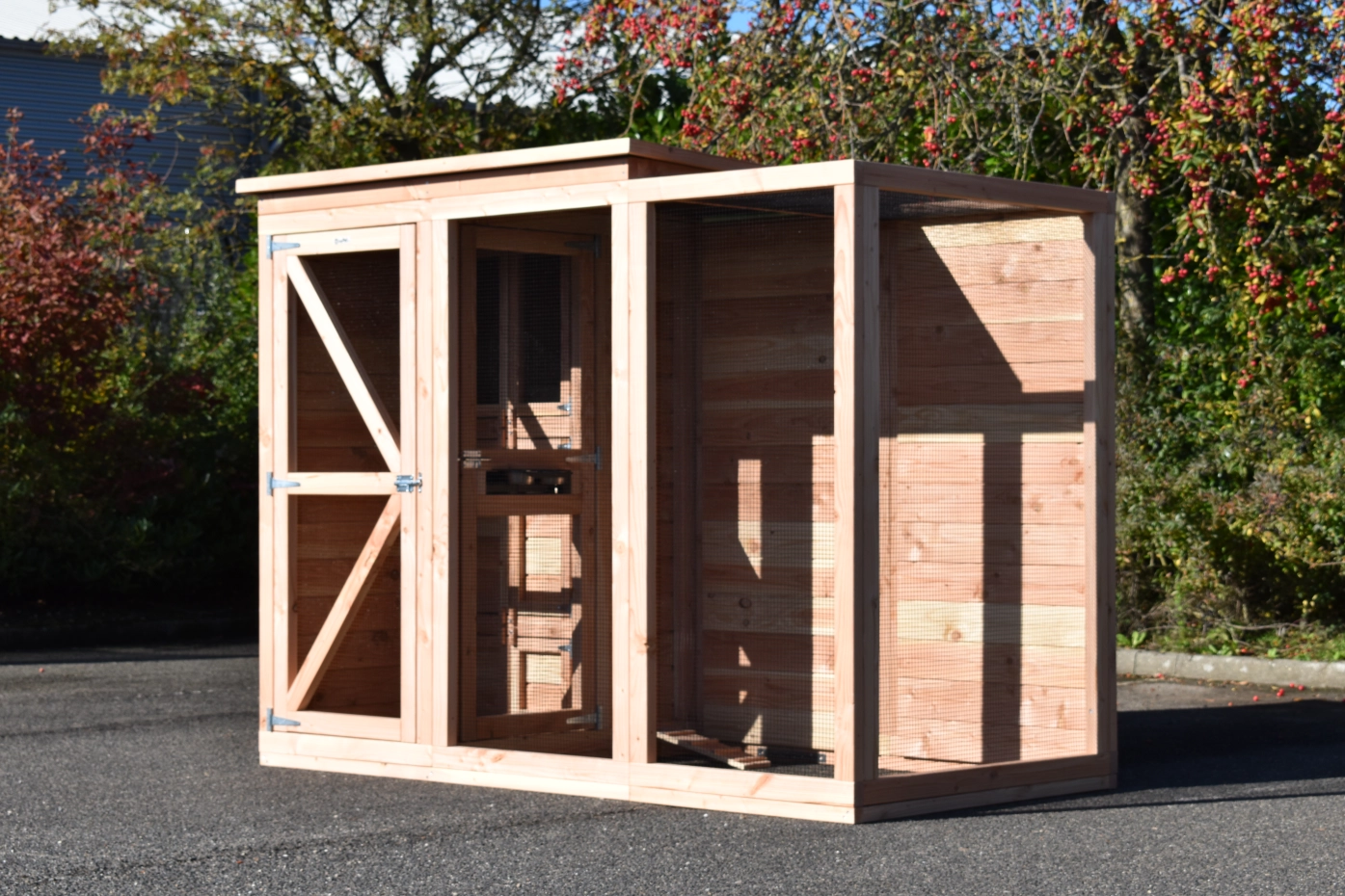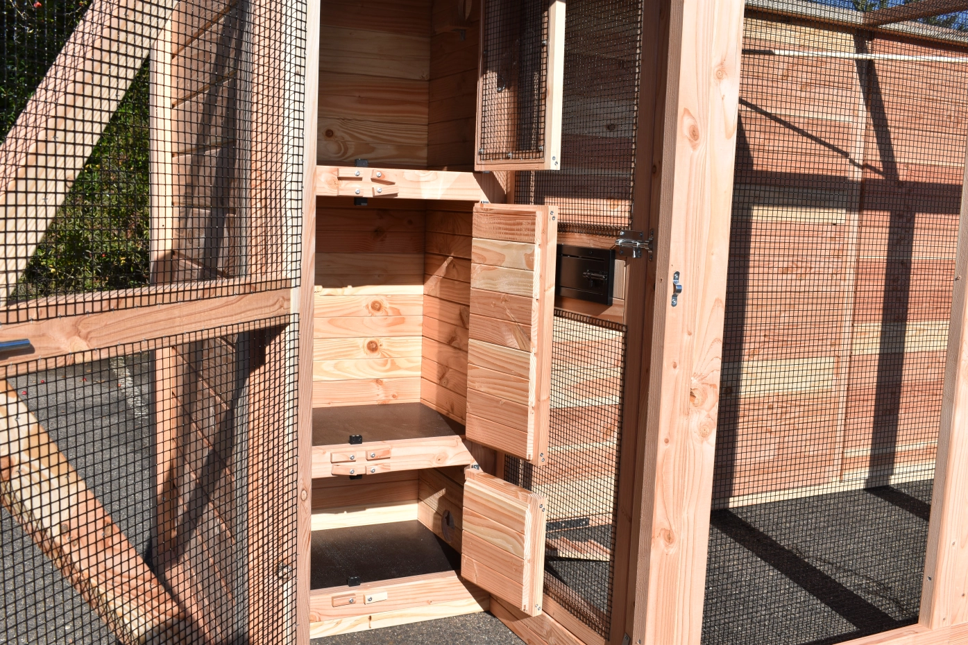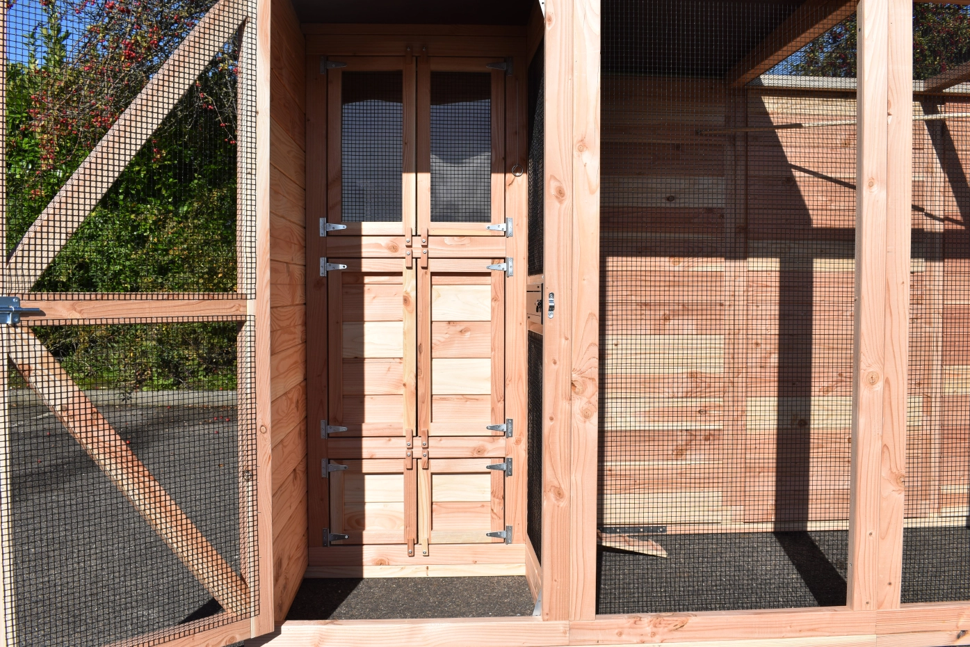 - Mit Schleuse für eine sichere Zugang zur Voliere. Die Türe sind von beiden Seiten zu sperren.