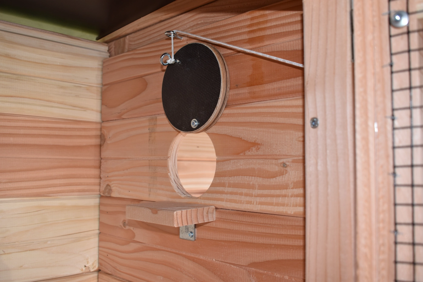 - Das Schützhaus der Voliere ist versehen mit einer Sitzstange