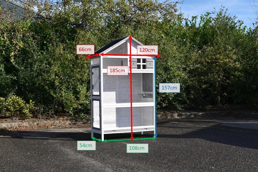 Vogelhaus Sara Large ist ein schönes Vogelhaus für draußen, aber natürlich kann es auch drinnen verwendet werden. Diese Voliere wird auch für Chinchillas genutzt. Die Voliere Sarah Large ist mit einem drehbaren Futteregal ausgestattet. Der Sarah Large verfügt außerdem über eine herausziehbare Kotwanne zur einfachen Reinigung. Die Voliere hat 2 Sitzstangen im Nachtbereich und 2 Sitzstangen im Flugbereich.