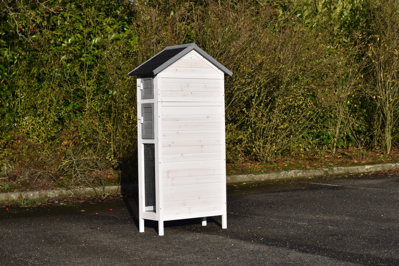 Zur Vermeidung von Rost- und Korrosionsbildung empfiehlt es sich, Schlösser und Beschläge regelmäßig mit Silikonspray oder Schlösserspray zu behandeln. Steht die Tierunterkunft nicht an einem geschützten Ort, empfehlen wir Ihnen, die Tierunterkunft zu verankern.