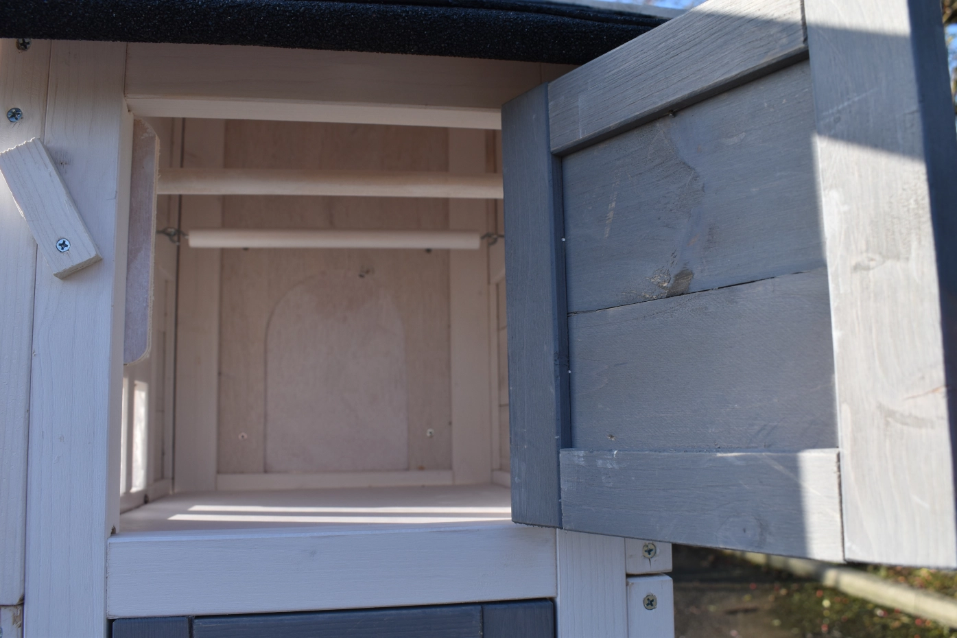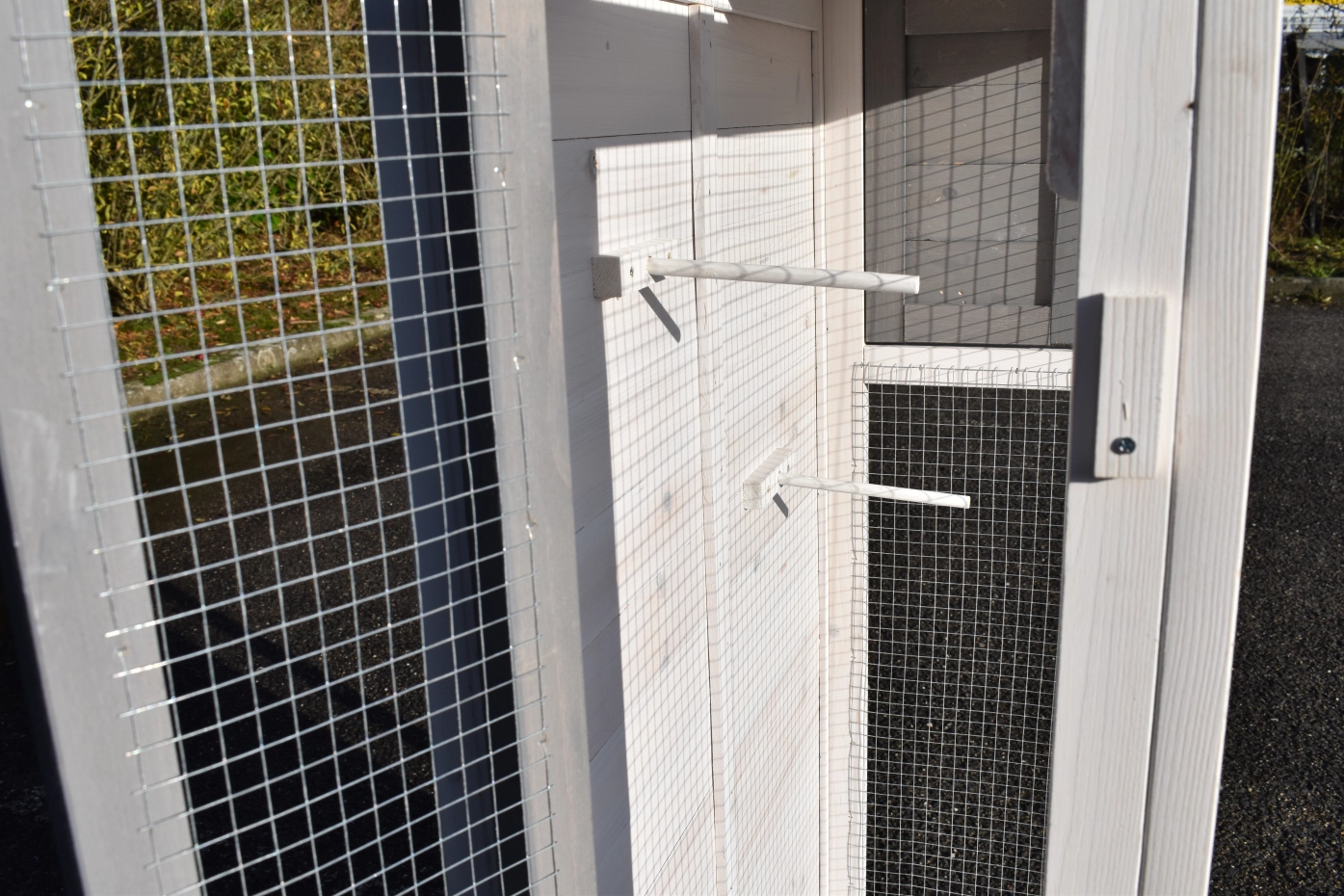 • Das Schützhaus der Voliere ist versehen mit einer Sitzstange