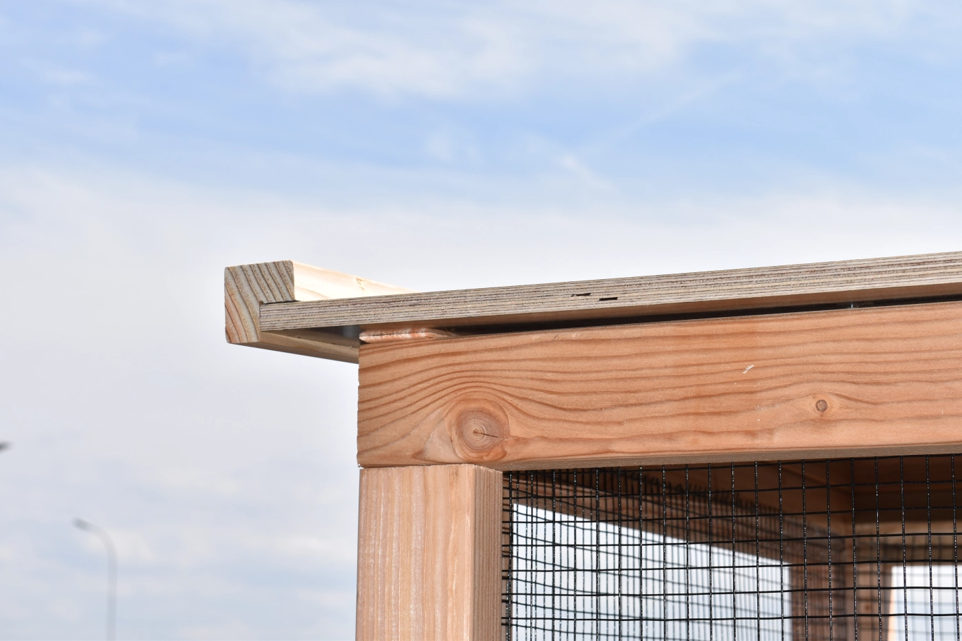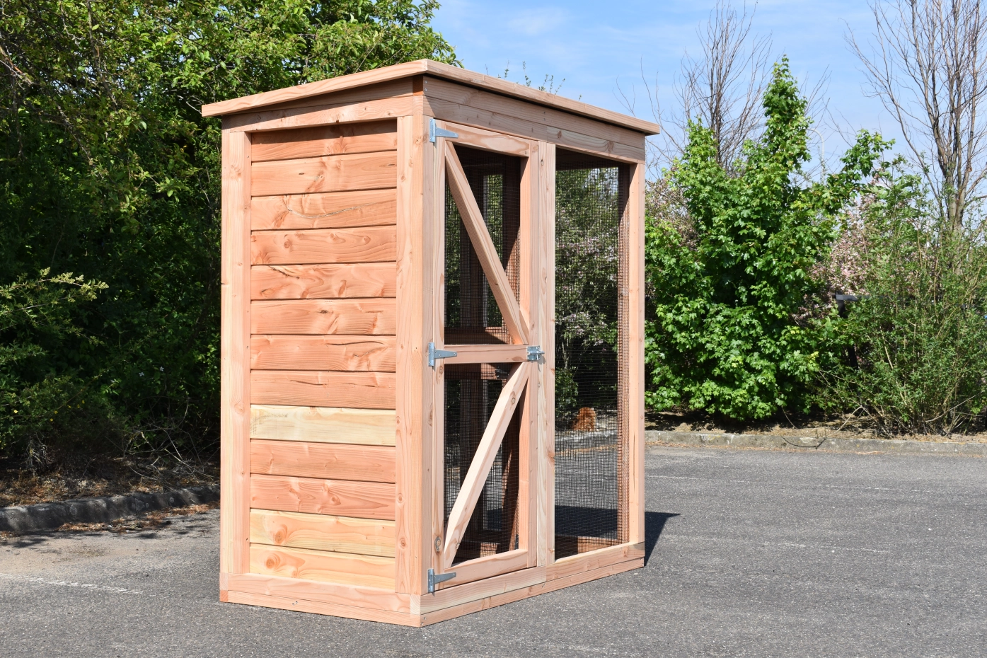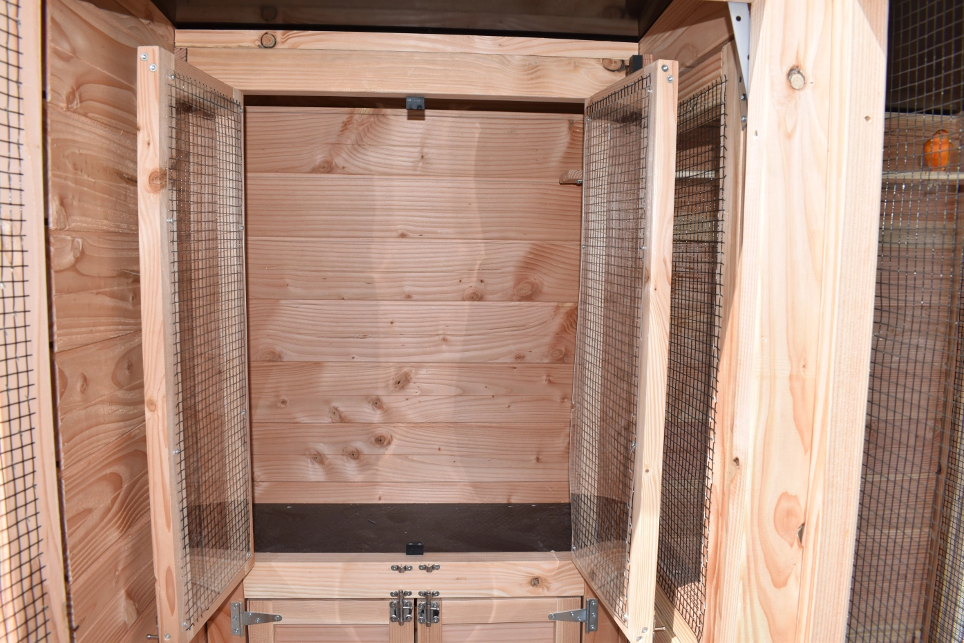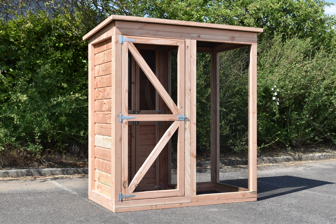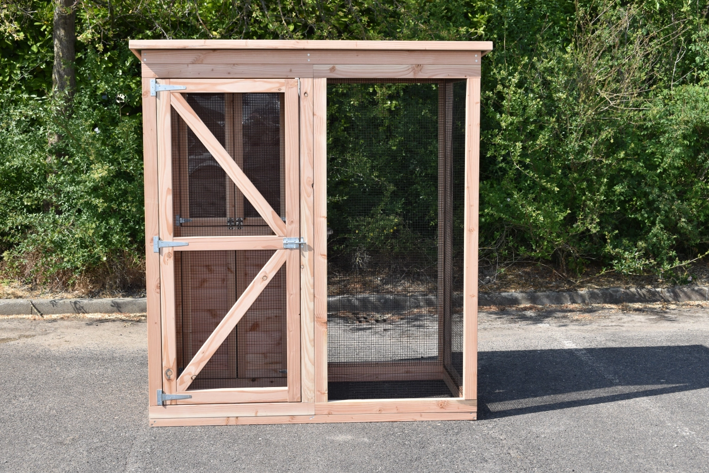 Voliere Flex 2.1 ist eine schöne Voliere für außen, mit überraschend schöne Details. Das Schutzhaus ist abschliessbar und mit 2 Türe versehen. Weiter gibt es noch Stauraum mit 2 Türe, Sitzstangen im Auslauf und ein Formular-Sperrholz-Dach.