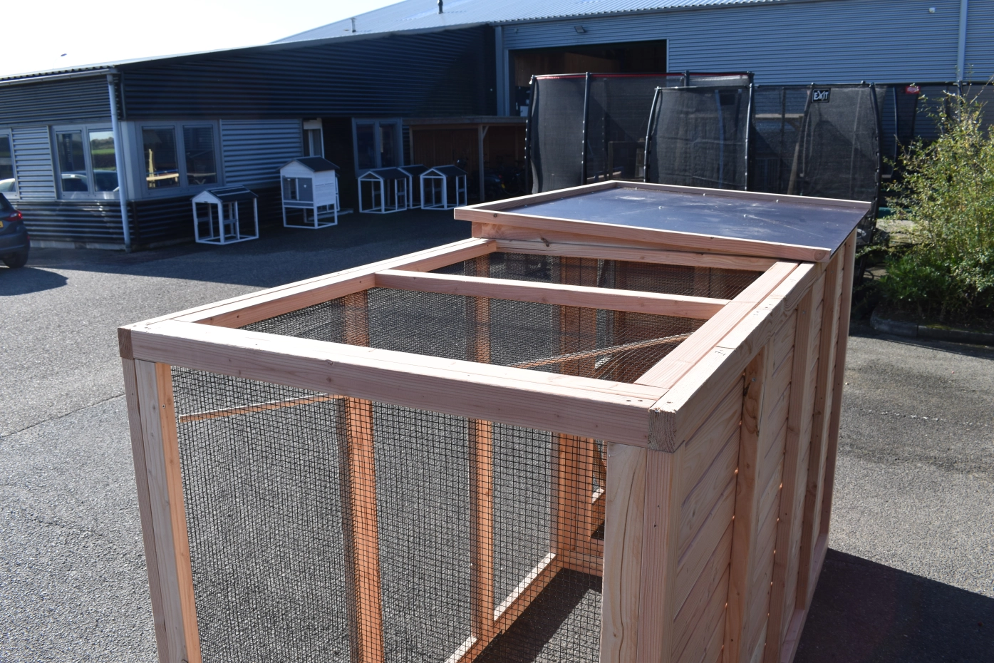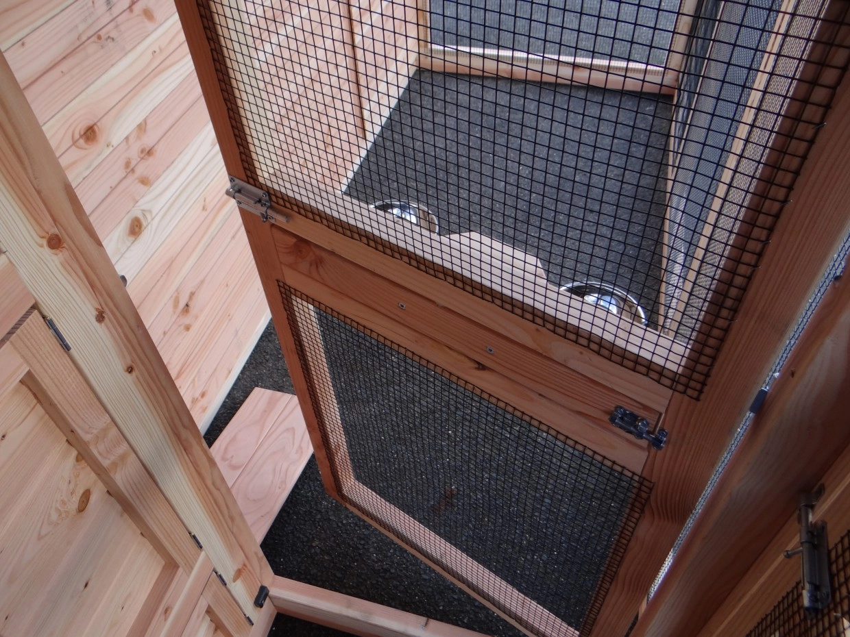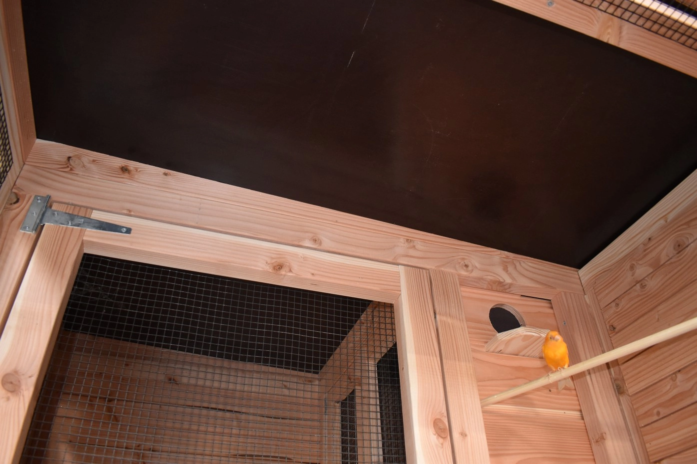 - Das Schlafhaus der Voliere ist verriegelbar