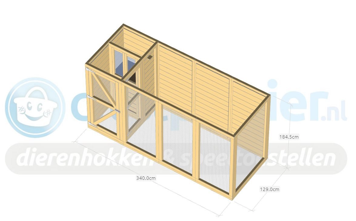- Der Stall besteht aus Paneelen von 180x85cm und 180x120cm. Die Paneele werden mit Schrauben miteinander verbunden. Bohrer, Schrauben und Bits sind im Lieferumfang enthalten.