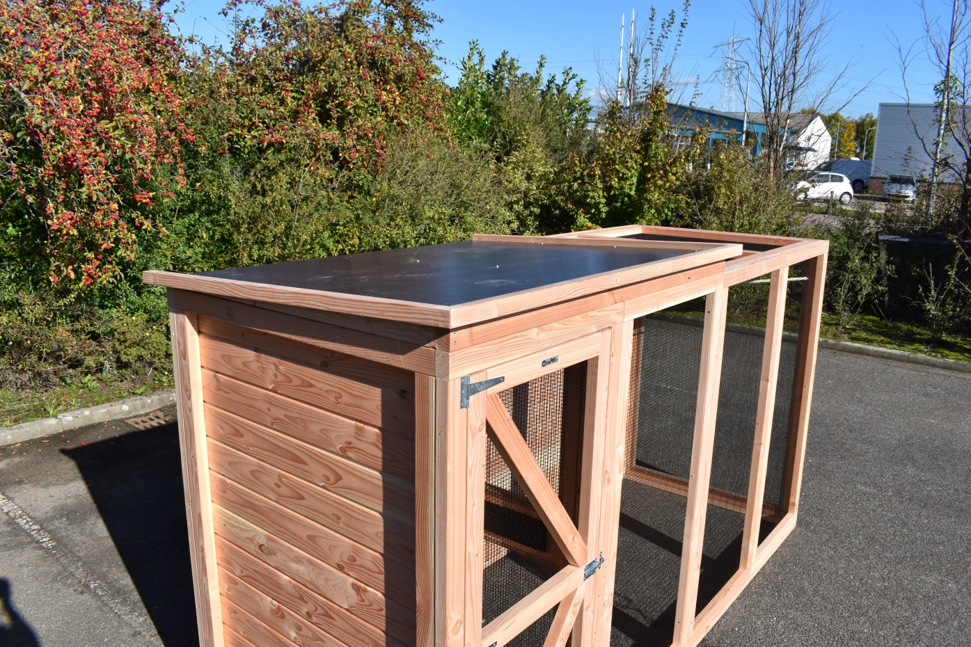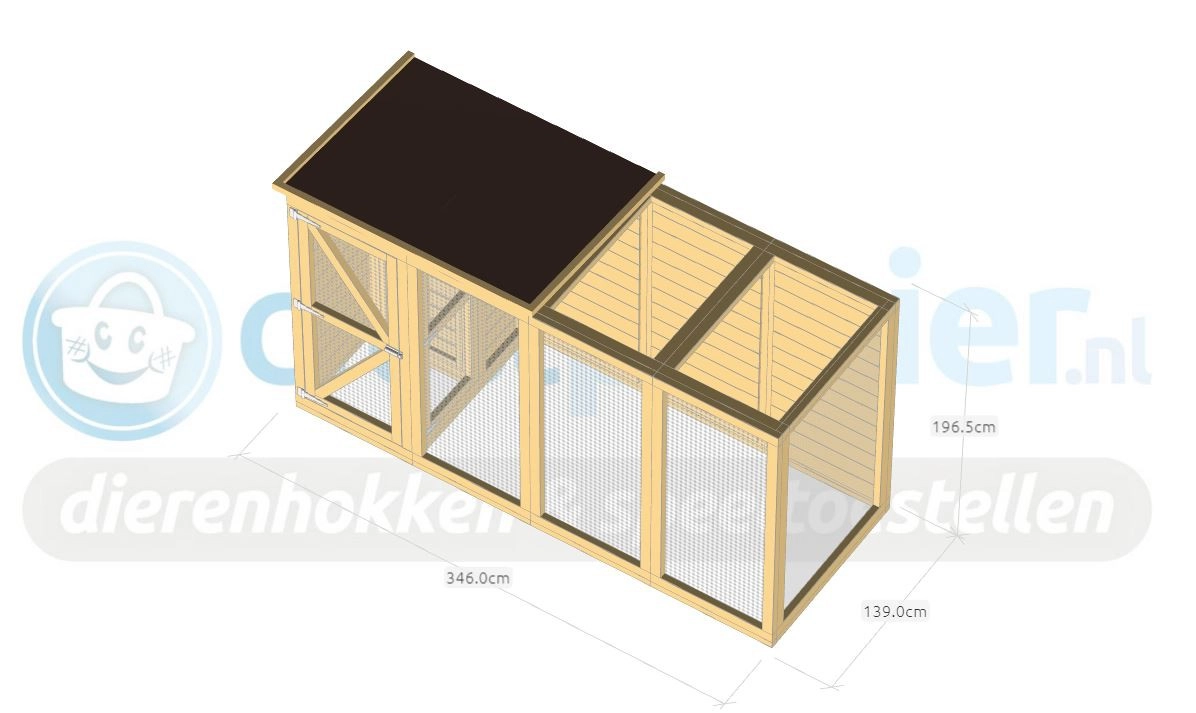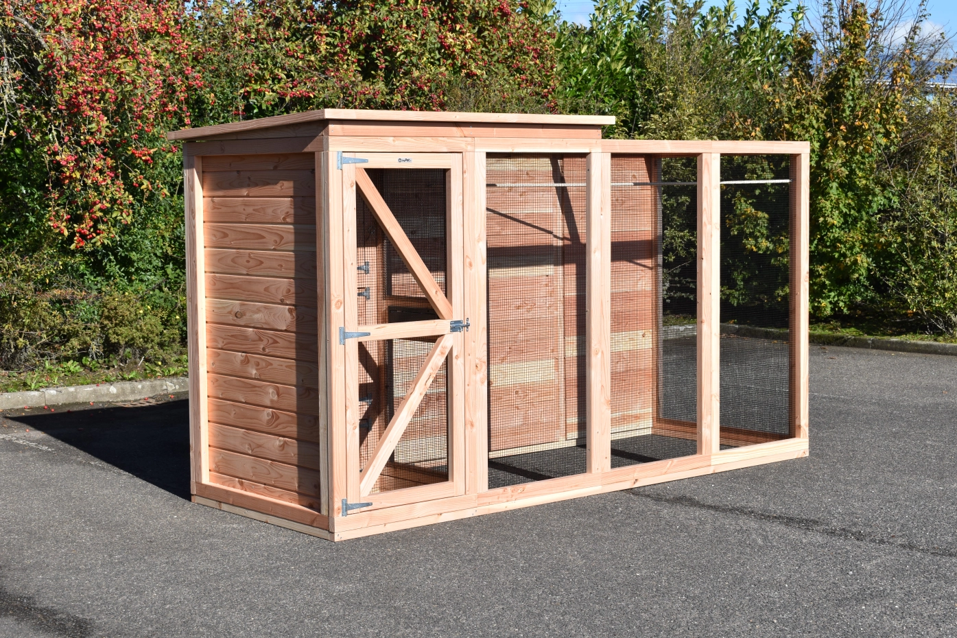 Voliere Flex 4.1 ist eine geräumige Voliere mit Schleuse und Schutzhaus. In dieser Voliere aus Douglasienholz können Sie tropische Vögel oder Wachteln halten und genießen Sie von vielen praktischen Vorteilen. Das Schutzhaus und ein Teil vom Auslauf sind mit einem geschlossenen Dach versehen. Das ist das höheres Teil vom Dach. Es gibt eine Schleuse von 80x75cm um zu verhindern das die Vögel weg fliegen können wenn Sie die Tür öffnen. Auch das Schutzhaus und Stauraum sind über die Schleuse zu erreichen. Die Tür in der Schleuse ist von beiden Seiten abschließbar.