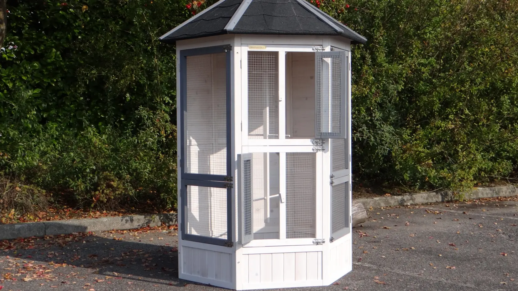 - Diese Volière ist aus schönem Kiefernholz gefertigt