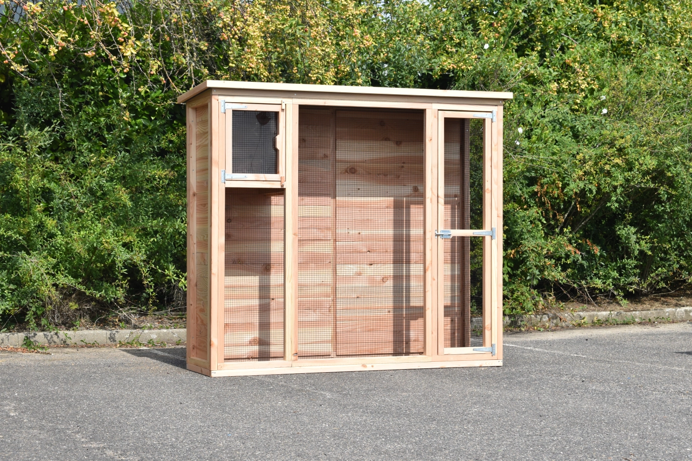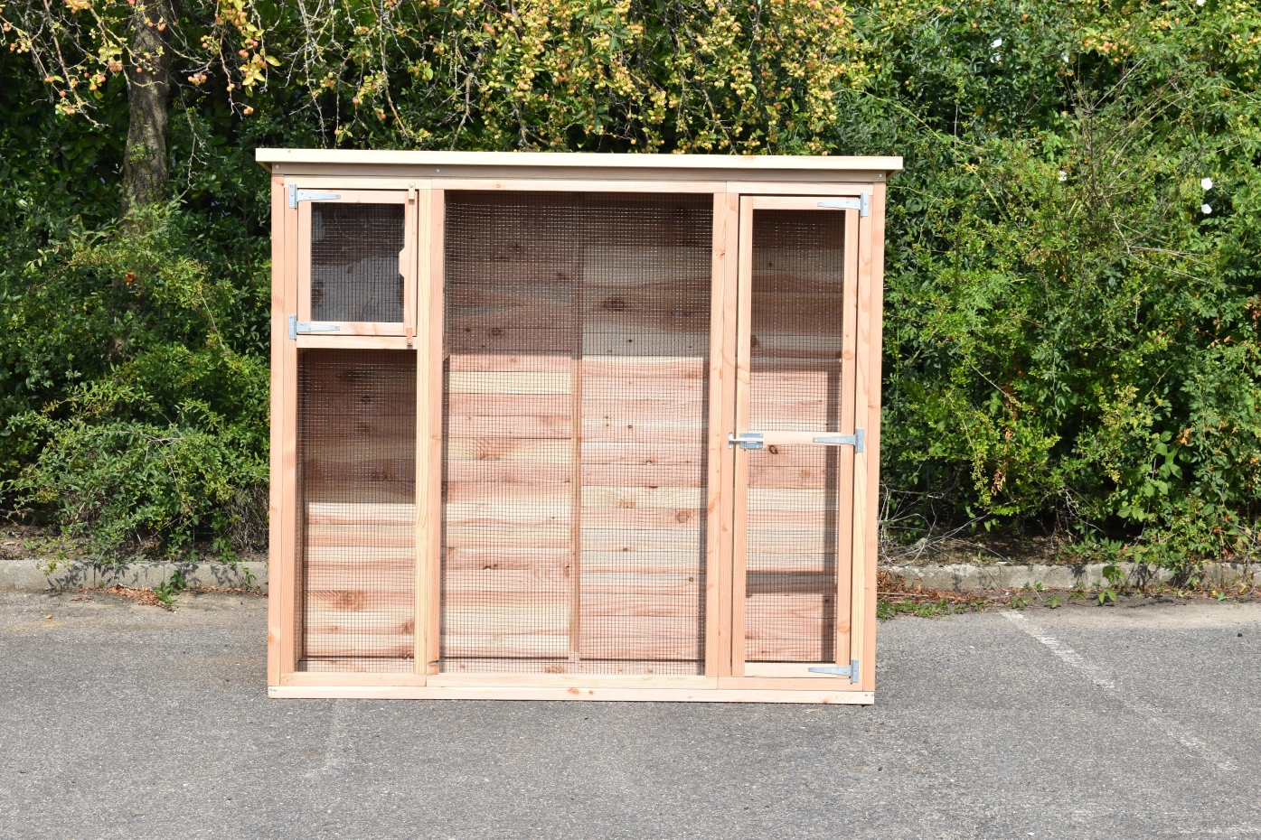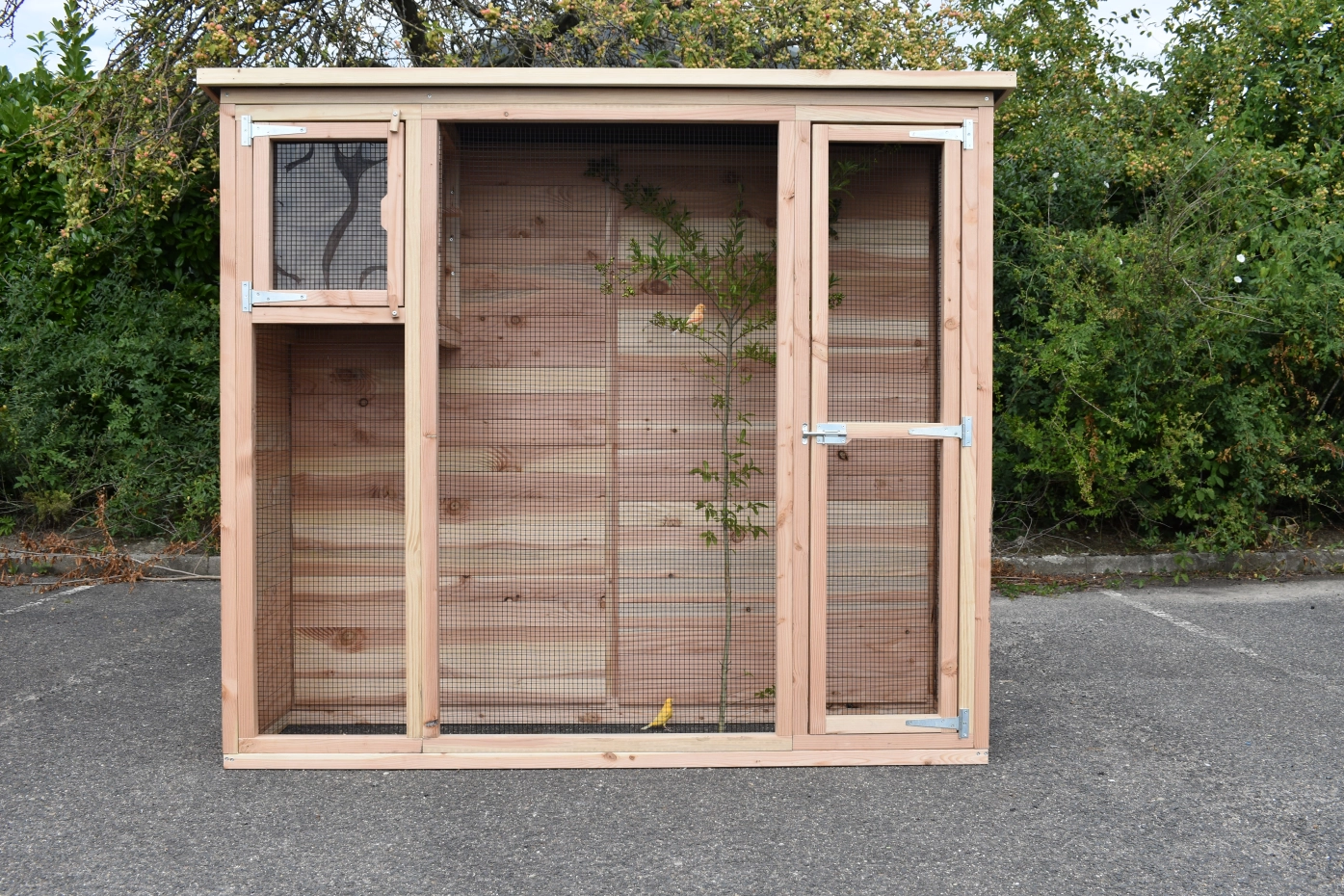 Voliere Maarten ist ein praktische Voliere für in ein kleine Garten. Diese schöne Voliere ist ausgestattet mit ein Schlafraum, welche ein Plexiglastür hat. Dadurch ist da viel Licht im Schlafraum. Der Rückseite und die Linken Seite sind ganz herstellt aus Holz, so dass Ihre Vogeln viel Schutzung haben. Der Voliere hat ein Dach aus Sperrholz mit ein Rand aus Douglasienholz.