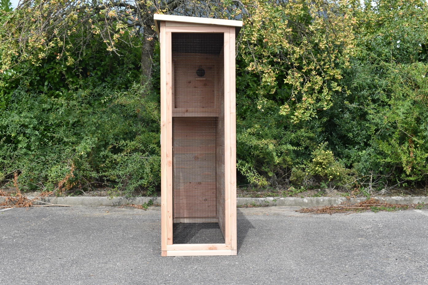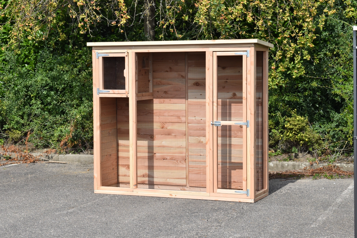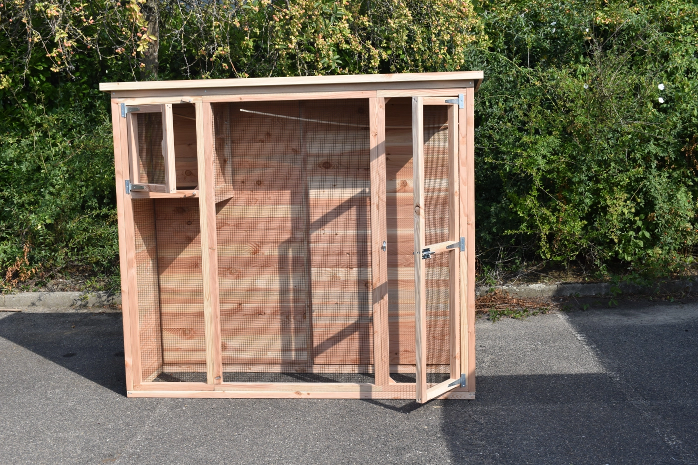 Voliere Maarten ist ein praktische Voliere für in ein kleine Garten. Diese schöne Voliere ist ausgestattet mit ein Schlafraum, welche ein Plexiglastür hat. Dadurch ist da viel Licht im Schlafraum. Der Rückseite und die Linken Seite sind ganz herstellt aus Holz, so dass Ihre Vogeln viel Schutzung haben. Der Voliere hat ein Dach aus Sperrholz mit ein Rand aus Douglasienholz.