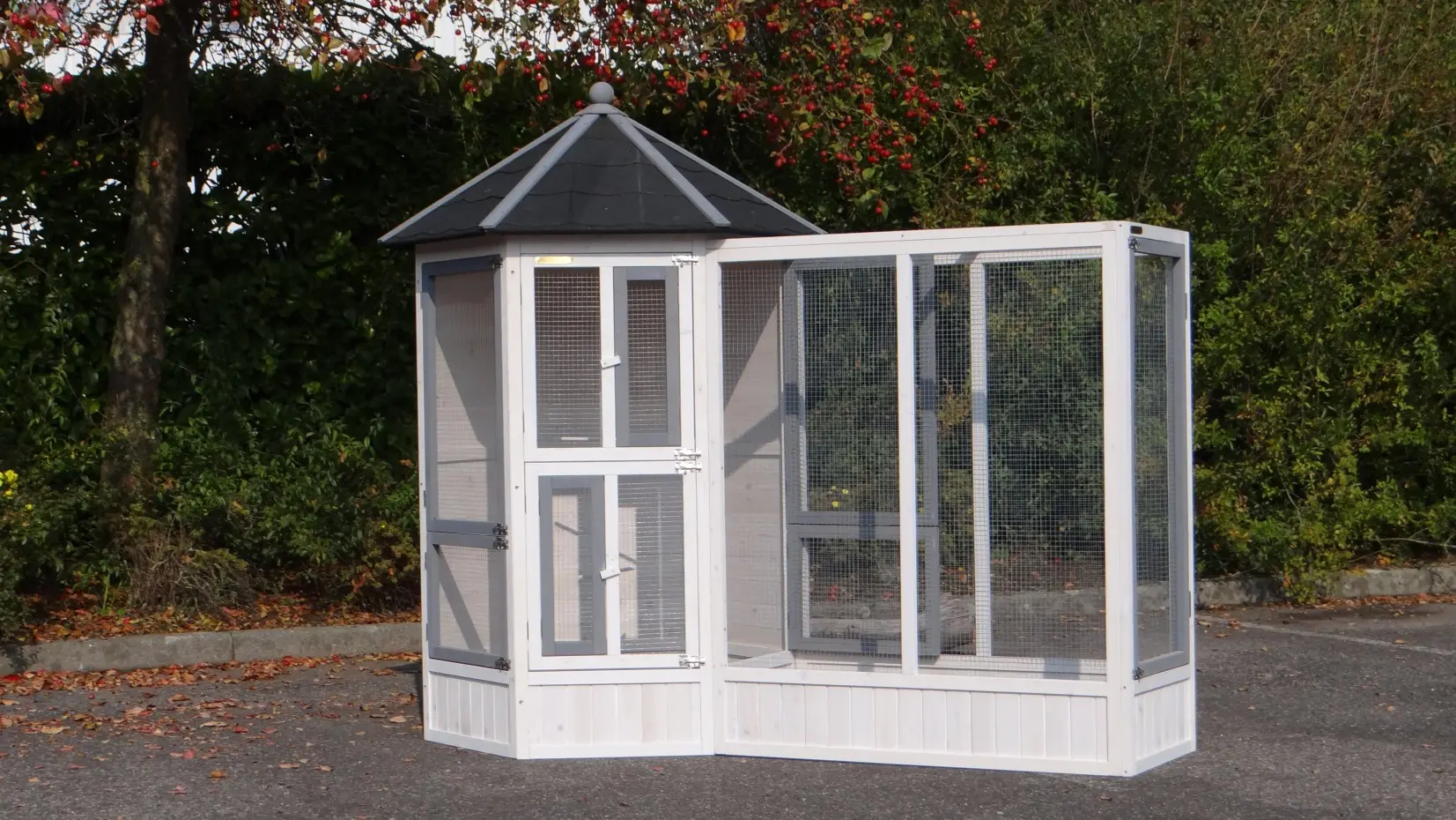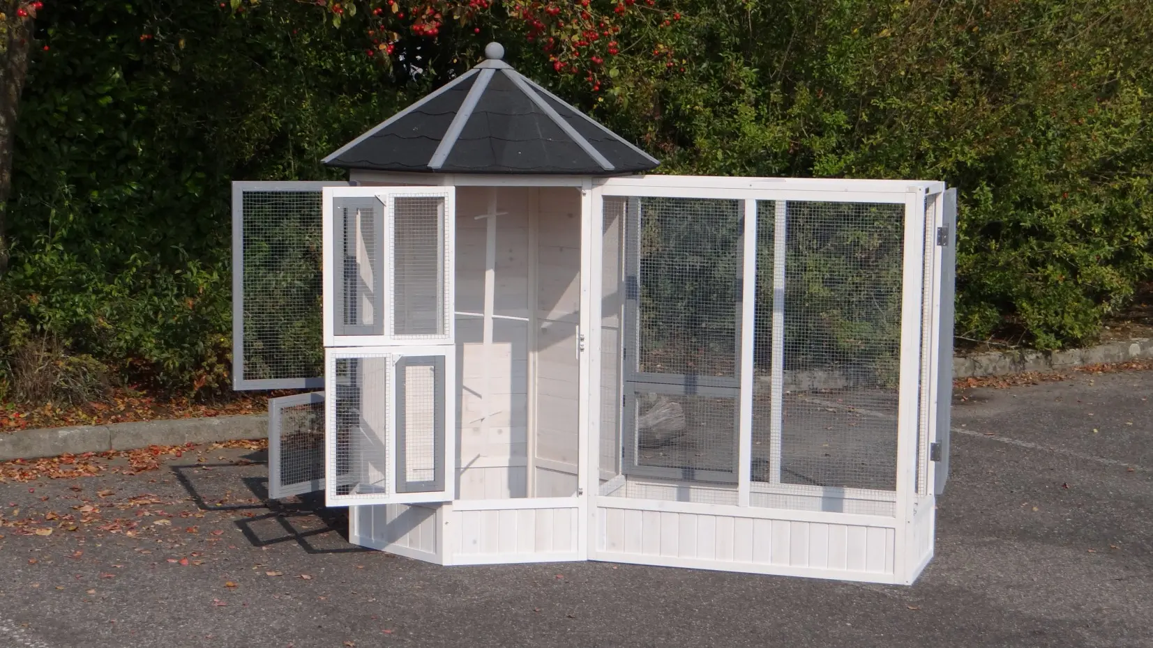 - Diese Volière ist aus schönem Kiefernholz gefertigt