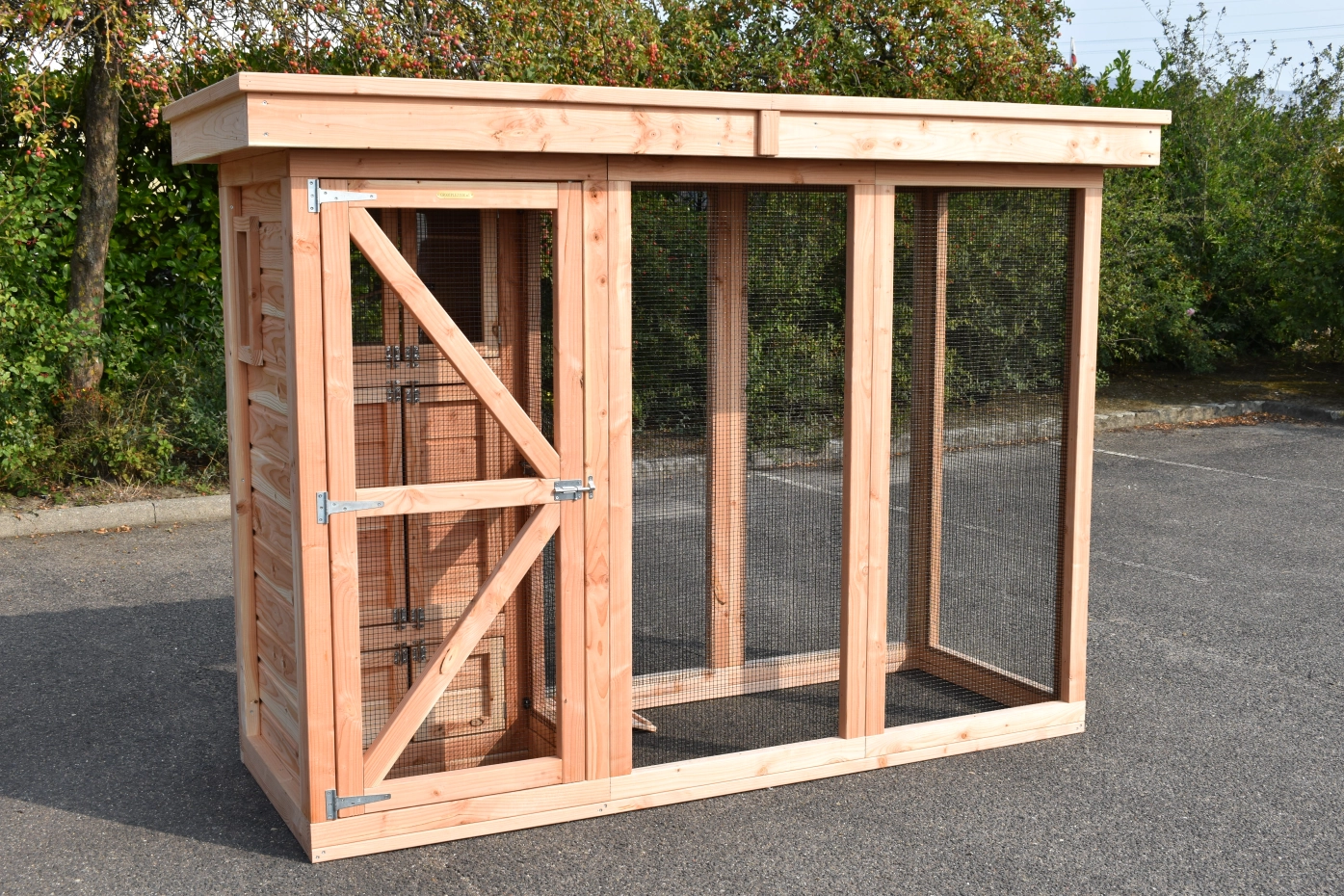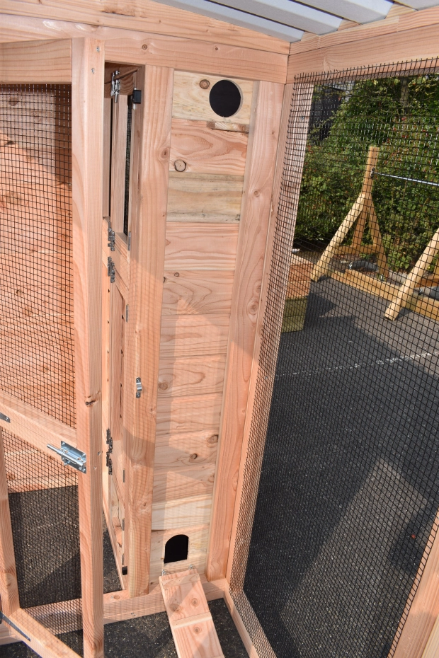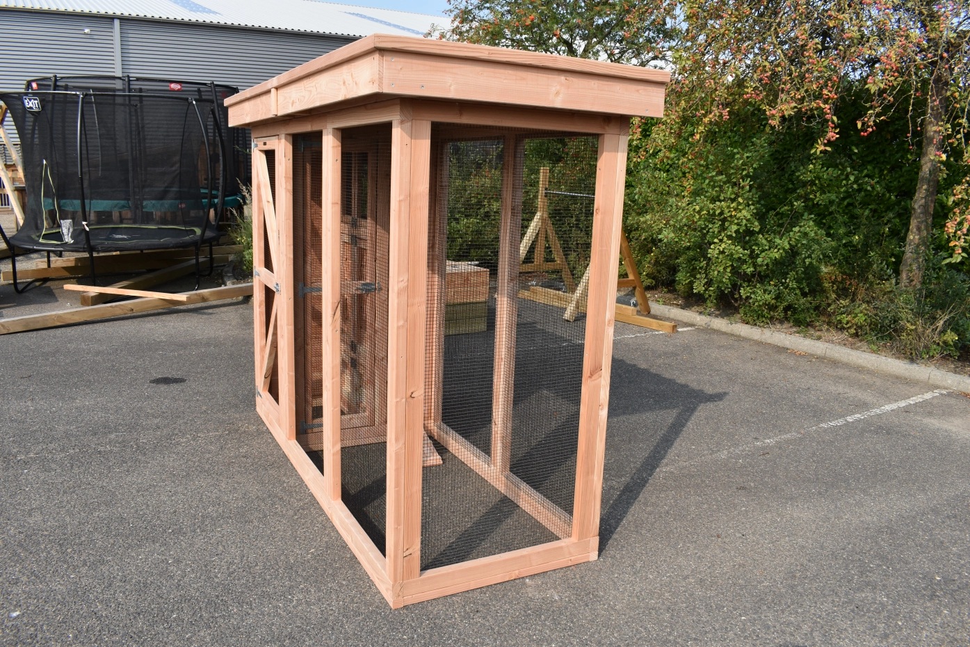 Voliere / Wachtelstall Flex 3.1 ist ein schöne Voliere für im Garten! Der Voliere hat ein Schleuse, um der Auslauf zu erreichen ohne die Gefahr das Ihre Tieren entkommen. Der Schlafraum ist ausgestattet mit 2 Türen. Der Flugloch ist abschließbar. Der Stall hat 2 Schlafräume, 1 Stauraum und ein Dach Luxe. Under der Stauraum befindet sich ein Schlafraum für Wachteln.