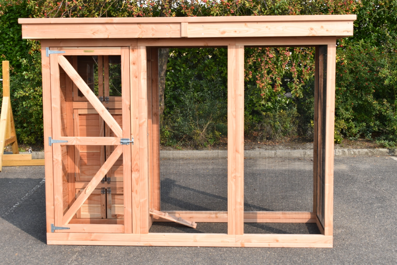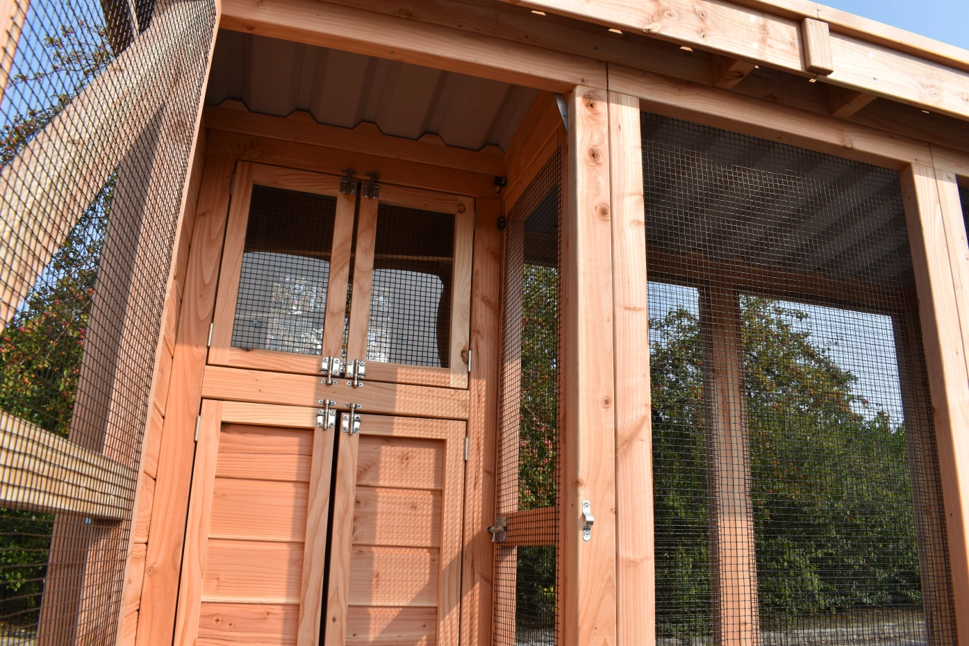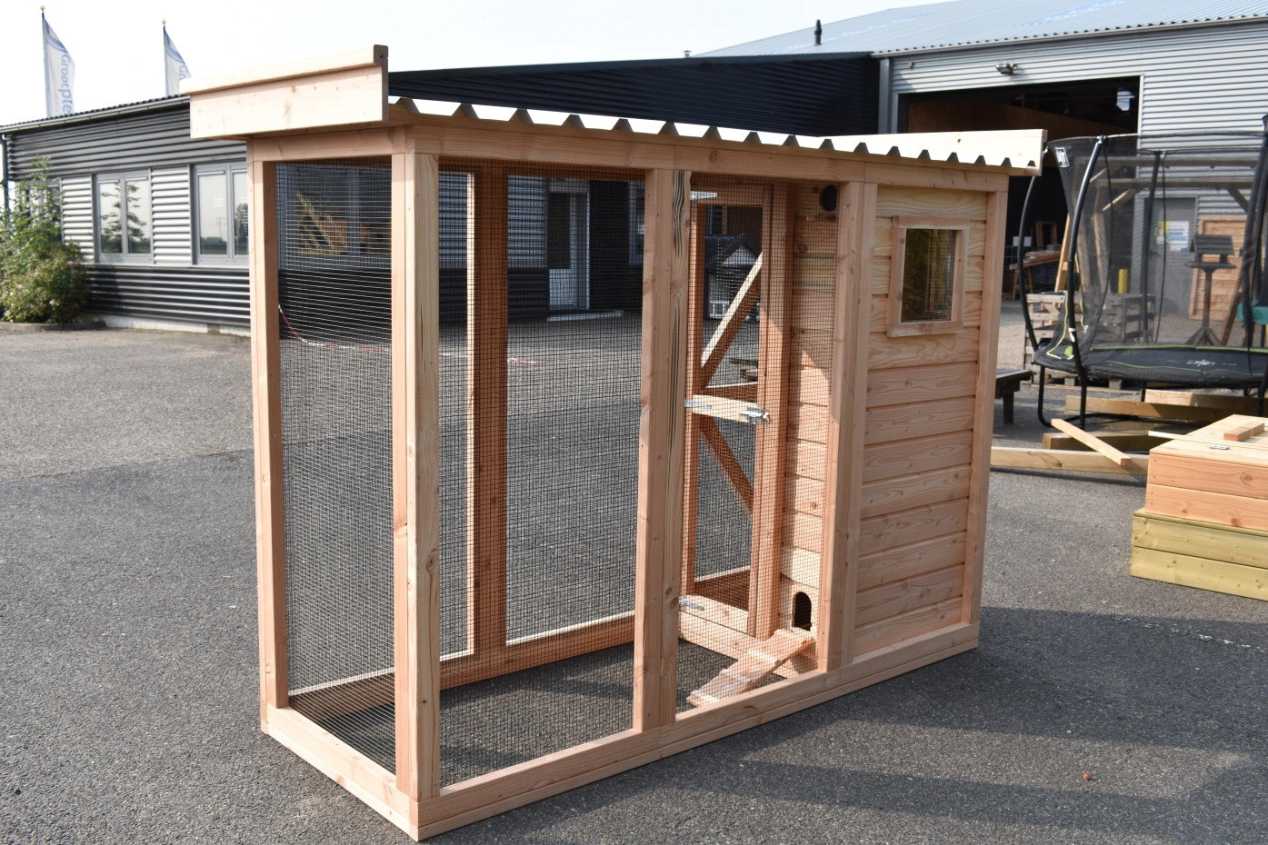 Voliere / Wachtelstall Flex 3.1 ist ein schöne Voliere für im Garten! Der Voliere hat ein Schleuse, um der Auslauf zu erreichen ohne die Gefahr das Ihre Tieren entkommen. Der Schlafraum ist ausgestattet mit 2 Türen. Der Flugloch ist abschließbar. Der Stall hat 2 Schlafräume, 1 Stauraum und ein Dach Luxe. Under der Stauraum befindet sich ein Schlafraum für Wachteln.